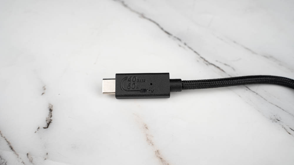 隨附的 USB4 傳輸線採用高耐用度編織線材,手感厚實且具良好柔韌性,不易打結或磨損。接頭外殼上刻有清晰的「40 Gbps / 60 W」標示,代表此傳輸線不僅支援 USB4 40Gbps 高速傳輸,亦具備最高 60 瓦電力供應能力,能同時滿足資料傳輸與供電需求。