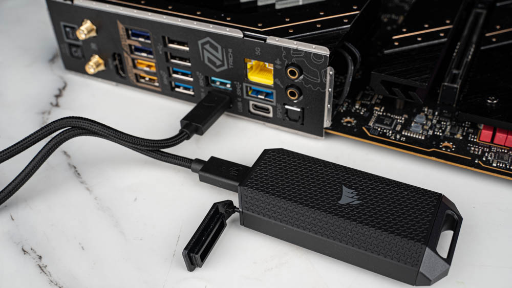 在實際測試過程中,小編將 CORSAIR EX400U SURVIVOR 直接連接至主機板背部的 USB4 Type-C 埠,以確保能發揮完整 40 Gbps 頻寬,展現最高效能。