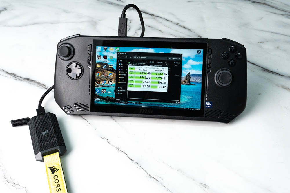 從上圖可見,當 CORSAIR EX400U SURVIVOR 透過 Thunderbolt 4 介面連接至掌上型主機後,其傳輸效能表現幾乎與官方標示值相當。根據 CrystalDiskMark 測試結果,連續讀取速度高達 4,054 MB/s,寫入速度約為 3,122 MB/s,充分展現Thunderbolt 4 介面所帶來的高頻寬優勢與穩定性能。