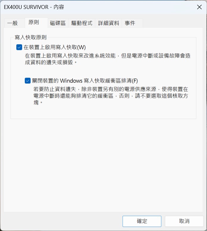 在測試 CORSAIR EX400U SURVIVOR 的過程中,小編啟用了「磁碟寫入快取」功能,使系統能先將資料暫存於 RAM,再批次寫入 SSD,進而提升測試時的穩定性與峰值效能。