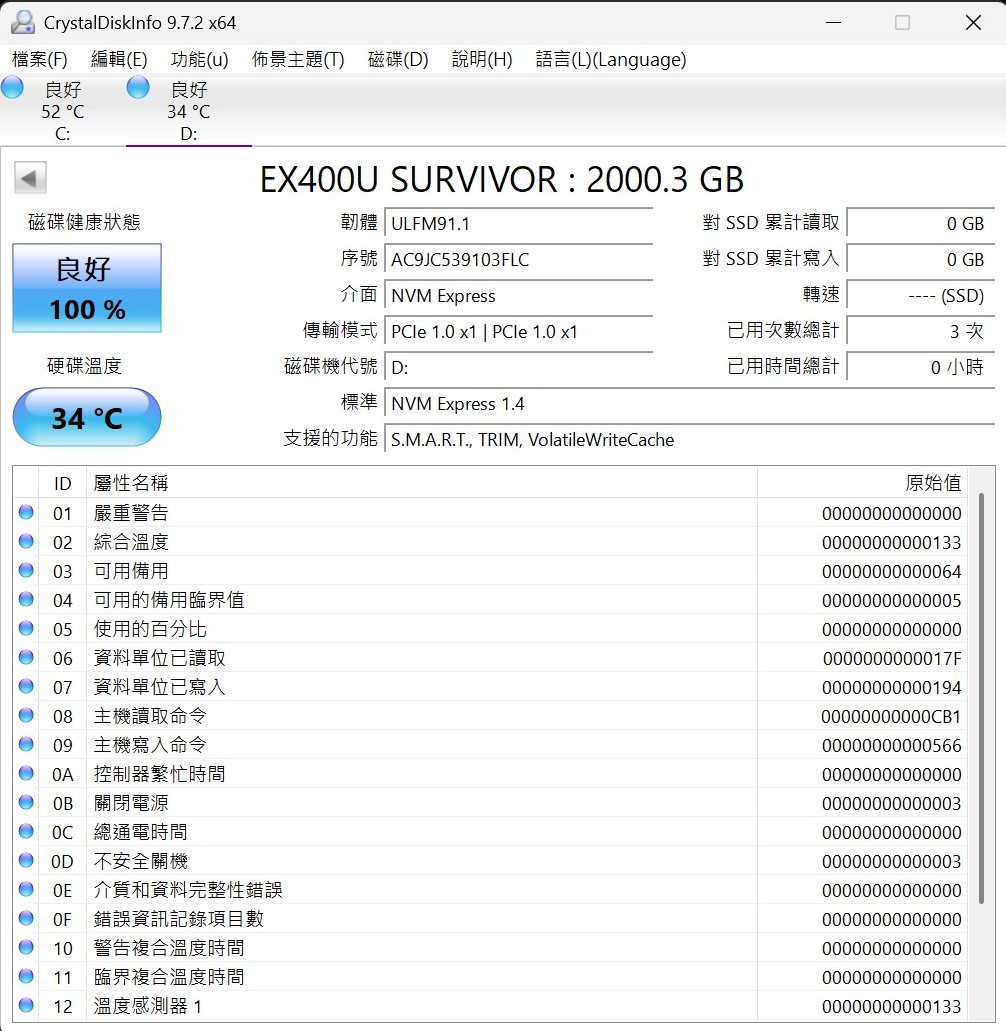透過 CrystalDiskInfo 檢視 CORSAIR EX400U SURVIVOR 的磁碟資訊,可見其採用 PCIe 1.0 x1 傳輸通道,並支援 NVMe 1.4 與 S.M.A.R.T. 指令集。