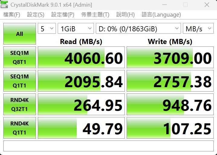 透過 CrystalDiskMark 實測,CORSAIR EX400U SURVIVOR 在循序讀取(1M Q8T1)項目中可達 4,060.6 MB/s,寫入速度則達 3,709.9 MB/s,展現出優異的高速傳輸效能。