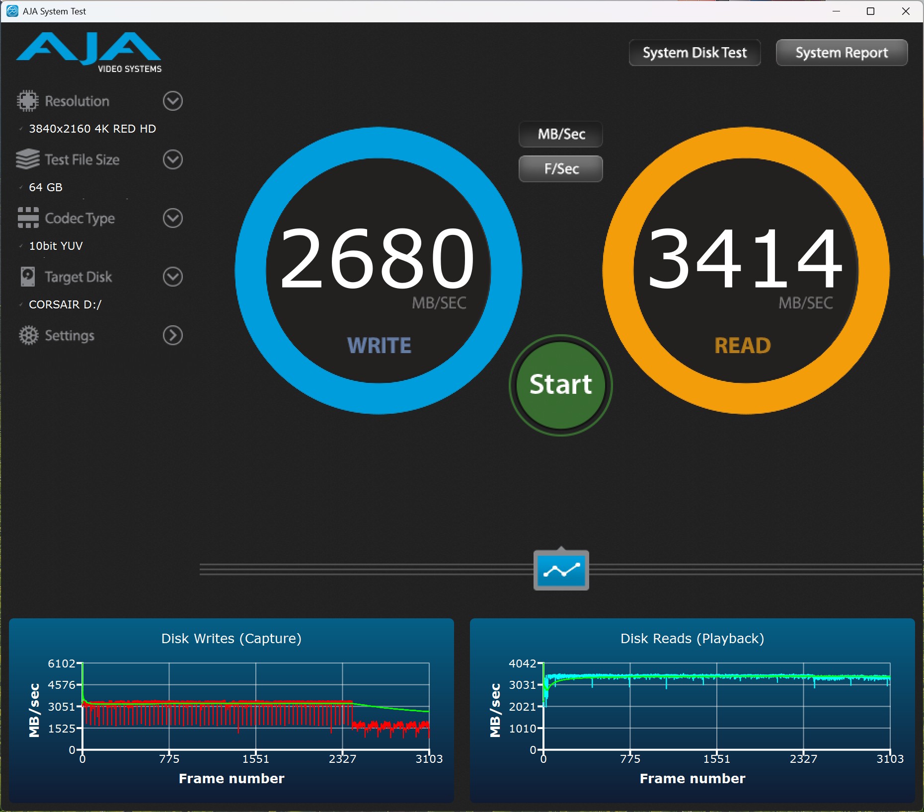 使用 AJA System Test 模擬 4K RED HD(64GB)影像傳輸時,CORSAIR EX400U SURVIVOR 的循序讀取速度達 3,414 MB/s,寫入速度約為 2,680 MB/s,整體展現穩定且高效的影音資料處理能力。