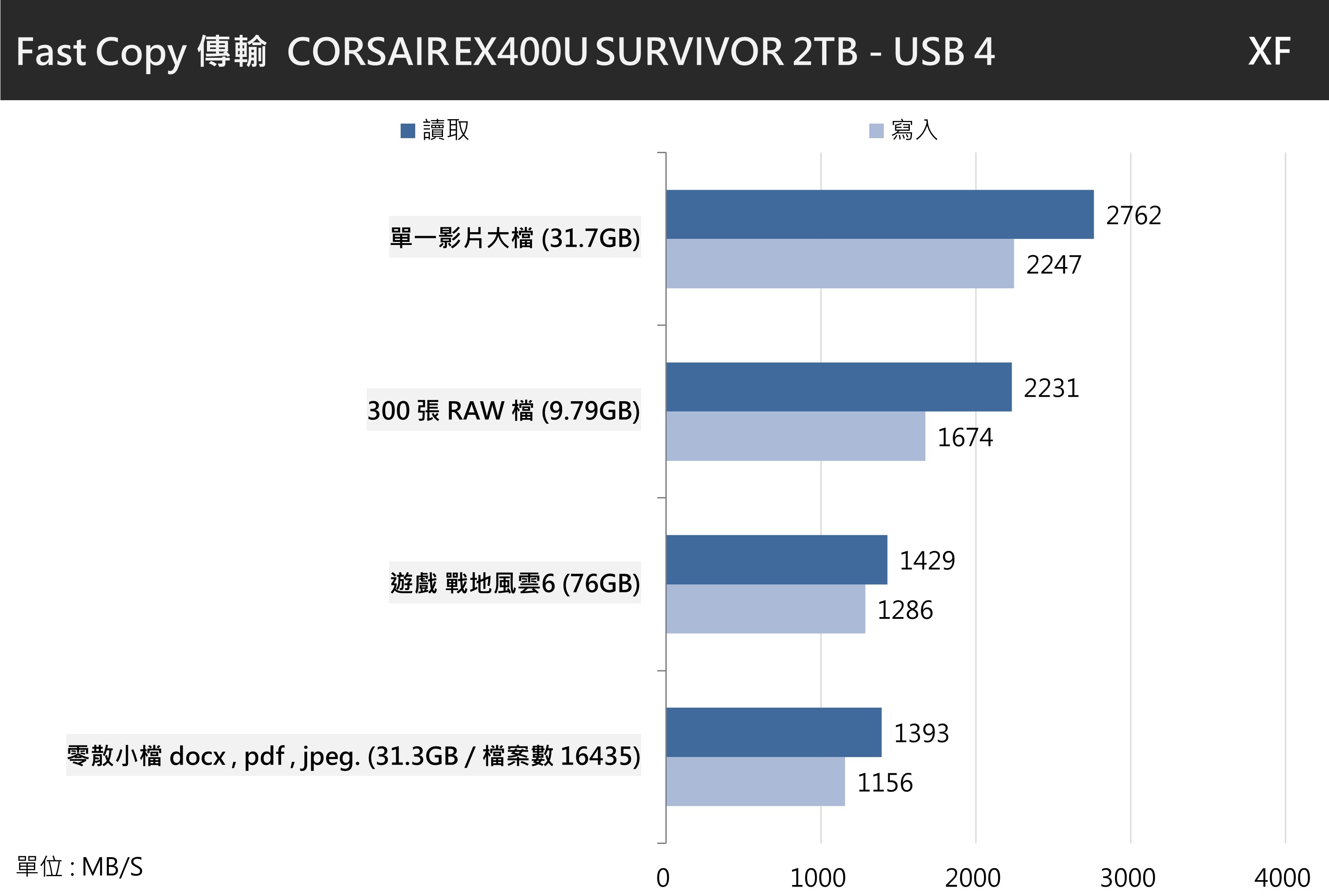 測試結果顯示,CORSAIR EX400U SURVIVOR 在單一影片大檔傳輸中,讀取速度達 2,762.1 MB/s、寫入 2,247.8 MB/s;RAW 照片資料讀取 2,231.4 MB/s、寫入 1,674.2 MB/s;遊戲資料夾複製讀取 1,429.7 MB/s、寫入 1,286 MB/s;零散小檔則達讀取 1,393.2 MB/s、寫入 1,156.8 MB/s,整體表現穩定且遠超傳統外接儲存裝置。