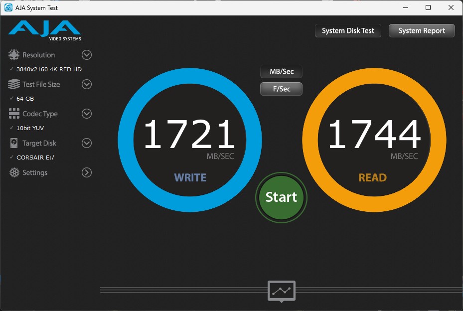 AJA System Test 模擬 4K RED HD 64GB 影像傳輸,循序讀取 1721 MB/s、寫入 1744 MB/s 的傳輸表現。