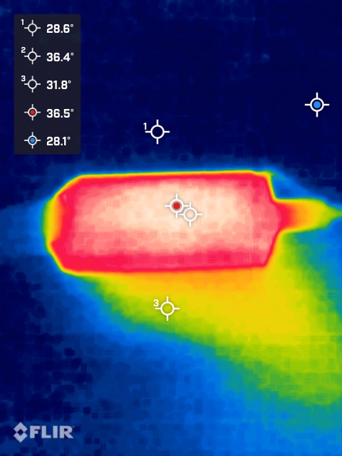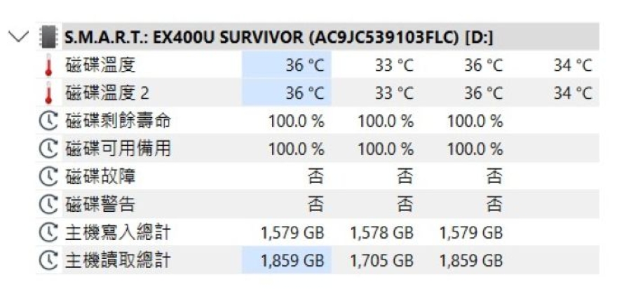 根據 CrystalDiskMark 測試結果,HWINFO 偵測到 CORSAIR EX400U SURVIVOR 的內部最高溫度為 36°C,測試環境為無風扇散熱、室溫 26°C(冷氣房)條件下。熱像儀檢測顯示外殼表面最高溫約為 36.5°C,整體溫度控制相當穩定,未出現明顯過熱或降速情形。