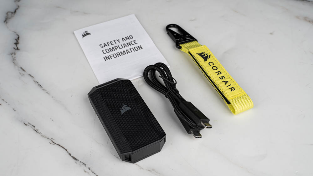 除了 CORSAIR EX400U SURVIVOR 外接式 SSD 本體外,包裝內還隨附 USB-C to USB-C 傳輸線、黃色 CORSAIR 吊掛掛繩以及使用說明書。