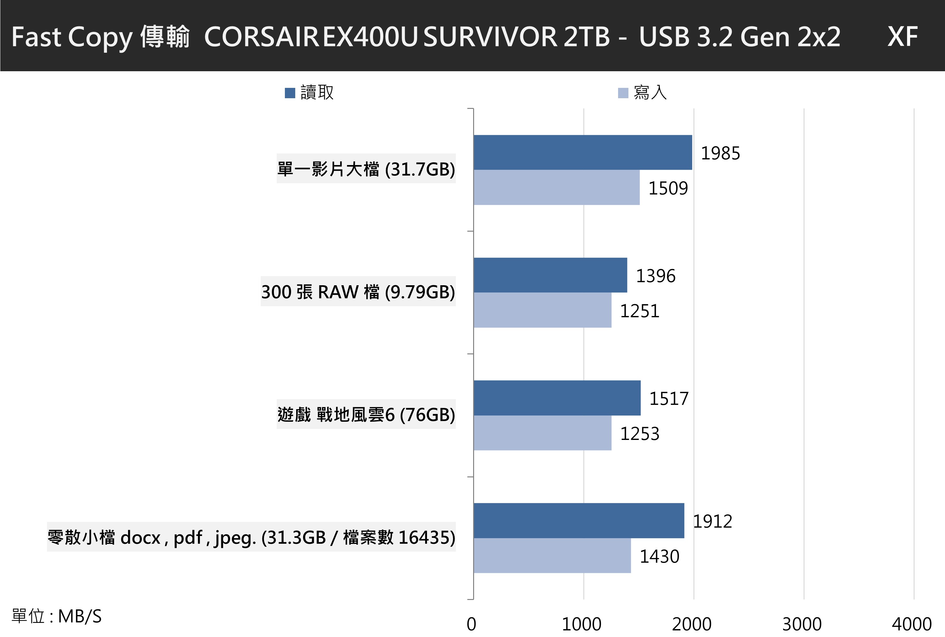 FastCopy 測試,CORSAIR EX400U SURVIVOR 傳輸單一影片大檔讀取 1985 MB/s、寫入 1509 MB/s;RAW 檔照片則是讀取 1396 MB/s、寫入 1251MB/s;遊戲資料夾複製讀取 1517 MB/s、寫入 1253 MB/s;零散小檔讀取 1912 MB/s、寫入 1430 MB/s。