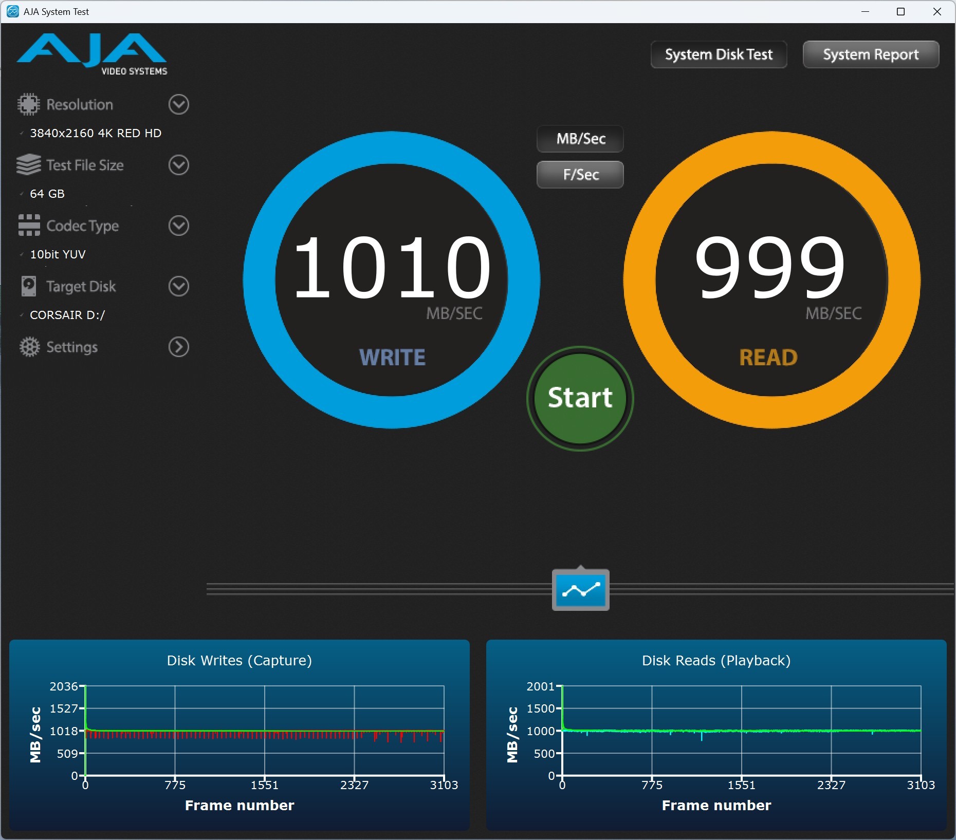 AJA System Test 模擬 4K RED HD 64GB 影像傳輸,循序讀取 1010 MB/s、寫入 999 MB/s 的傳輸表現。