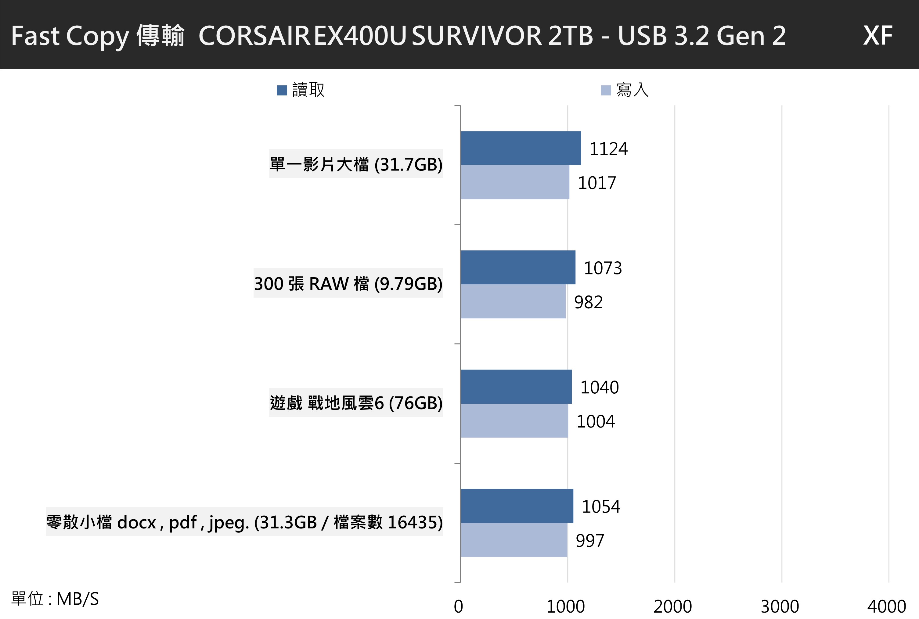 FastCopy 測試,CORSAIR EX400U SURVIVOR 傳輸單一影片大檔讀取 1124 MB/s、寫入 1017 MB/s;RAW 檔照片則是讀取 1073 MB/s、寫入 982MB/s;遊戲資料夾複製讀取 1040 MB/s、寫入 1004 MB/s;零散小檔讀取 1054 MB/s、寫入 997 MB/s。