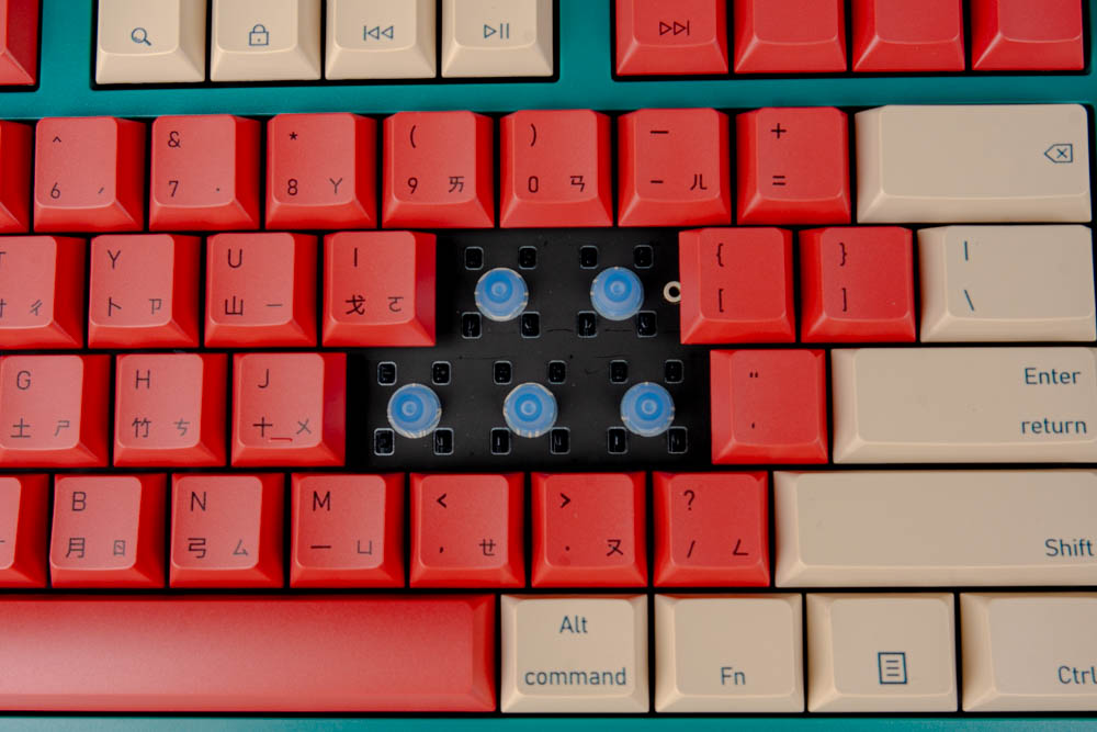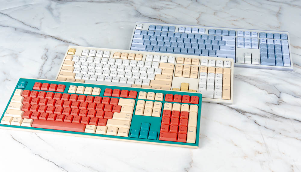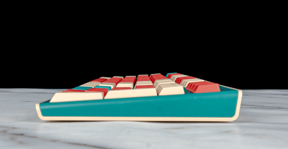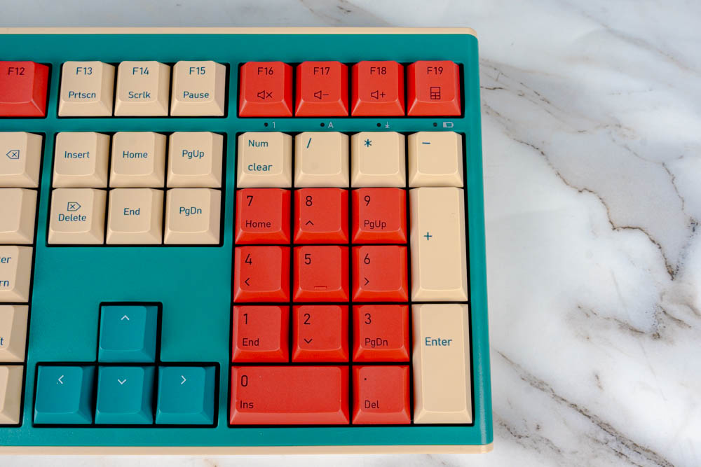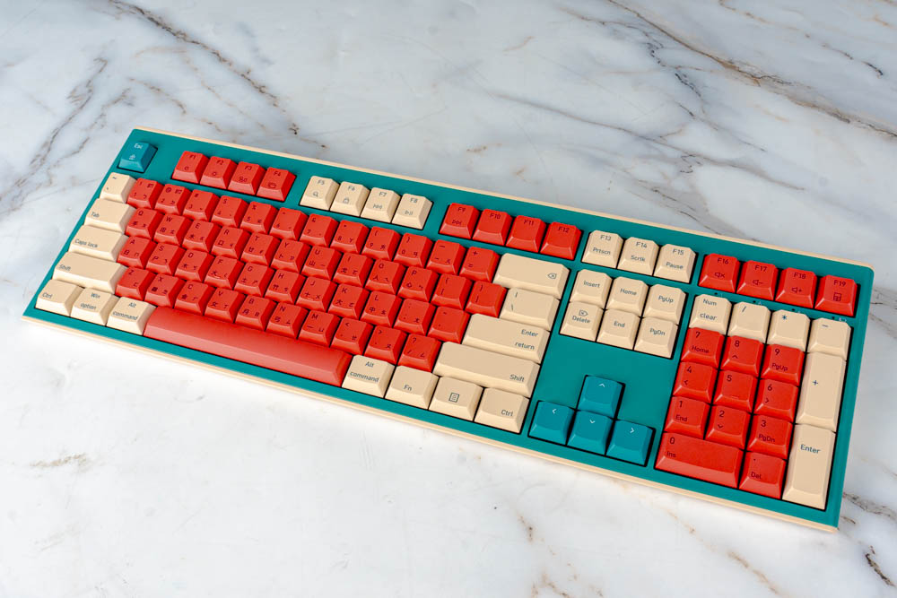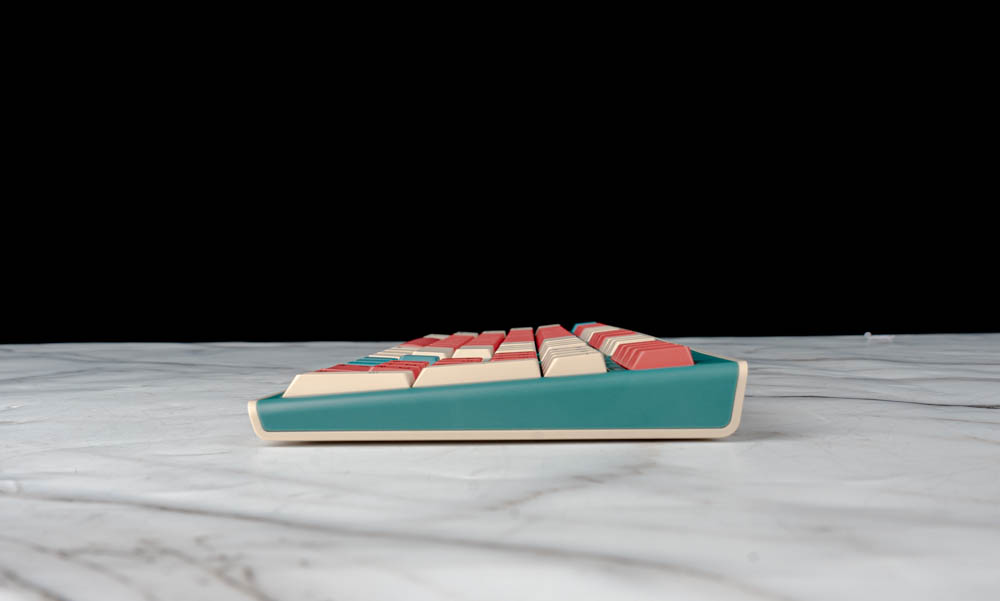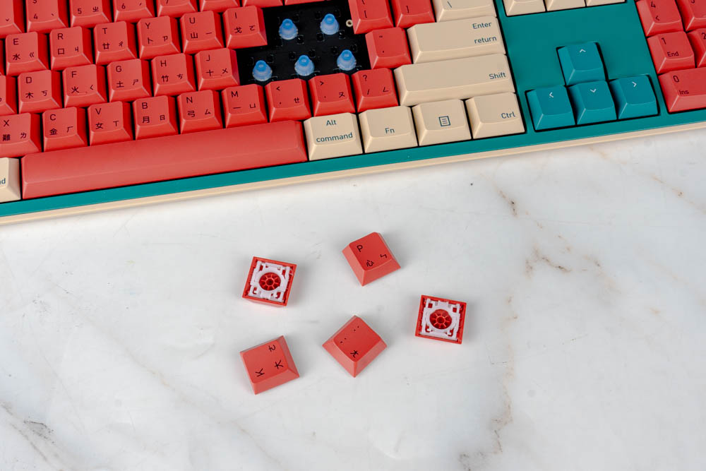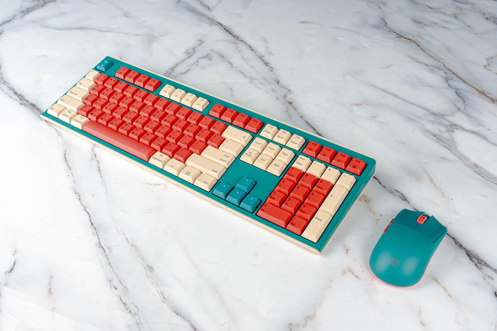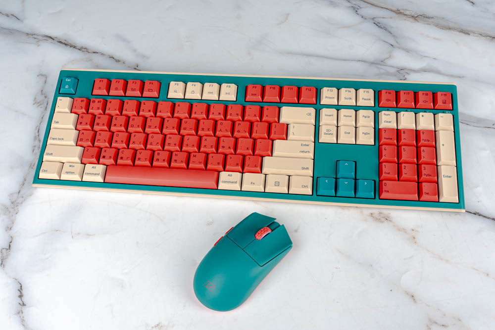 三款配色中最吸引眼球的莫過於海松石綠,它展現出日本大正時代融合傳統與西洋風格的「大正浪漫」美學。海松石綠的鍵盤本體搭配鮮明飽滿的紅色鍵帽,視覺強烈而富有層次;中間穿插的米黃色鍵區則巧妙地緩和了整體色彩的衝擊,讓整個配色既大膽又和諧。