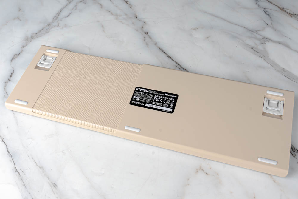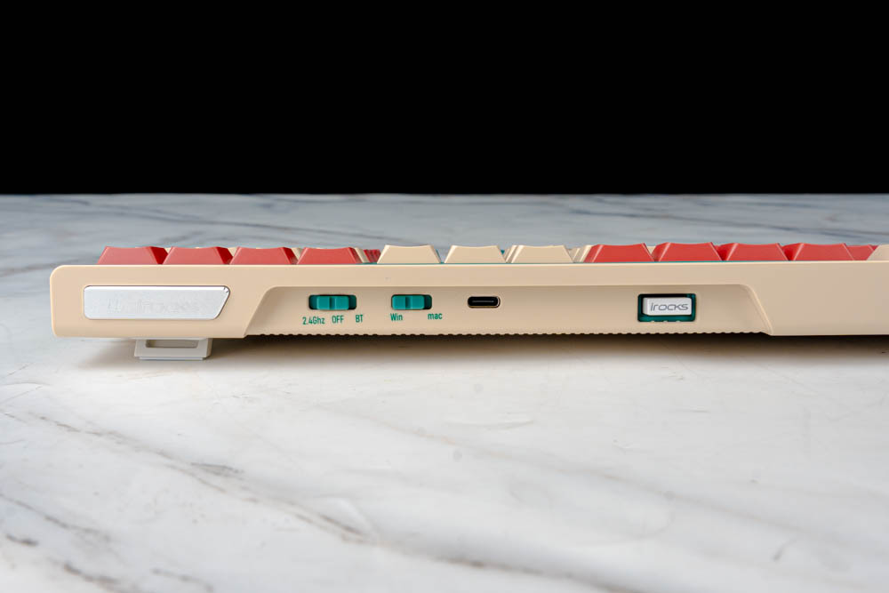 在鍵盤頂部可以看到 K105RP 的主要切換控制區,有2.4GHz / OFF / 藍牙的三段式切換開關與 Win / Mac 系統切換鍵,讓使用者在不同系統間工作時能立即切換,鍵位配置也會同步調整。中間的 USB-C 端口則用於充電與有線連接,提供更穩定的使用體驗。