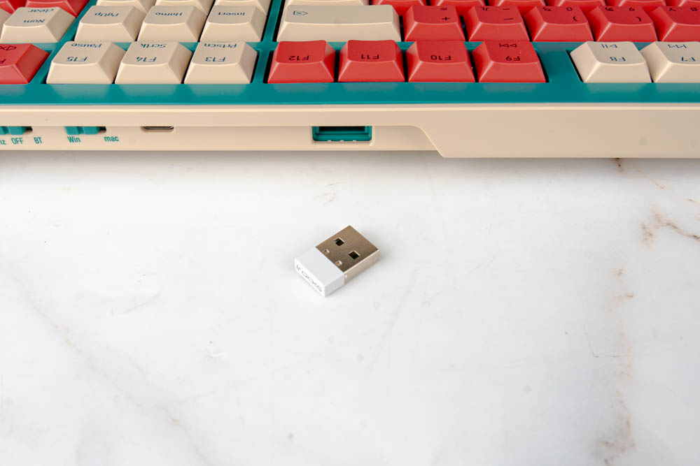 圖中右側的白色小模組就是 2.4GHz 無線接收器,平時可以收納在鍵盤頂部專屬的凹槽位置,方便攜帶。使用 2.4GHz 模式時,只需要將這個接收器插入電腦的 USB-A 介面,就能立即完成配對並使用鍵盤,免驅動、即插即用,對常常需要外出工作或切換不同設備的使用者來說相當方便。