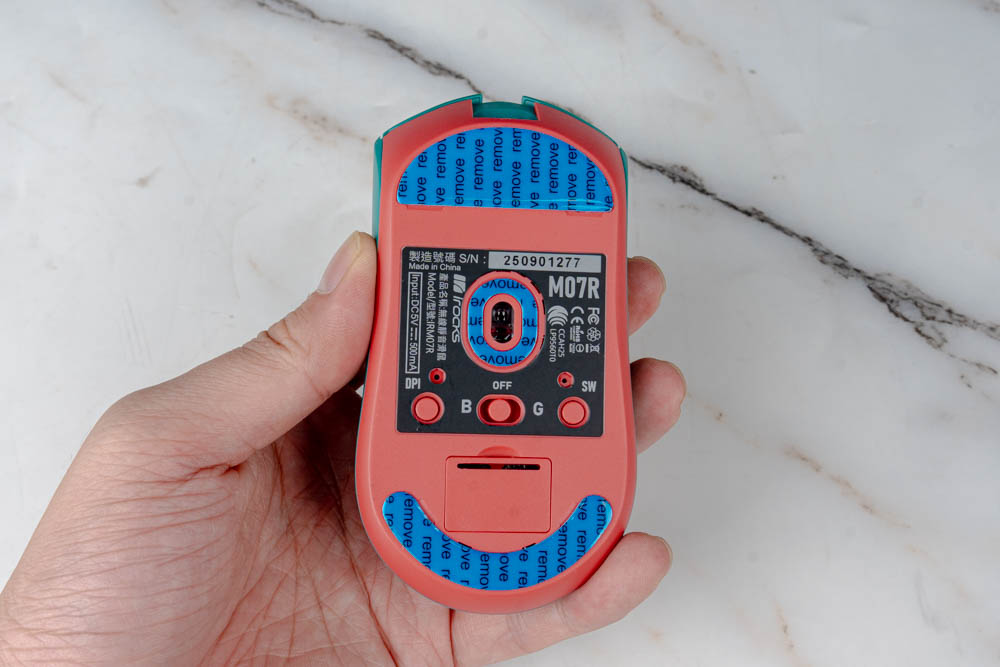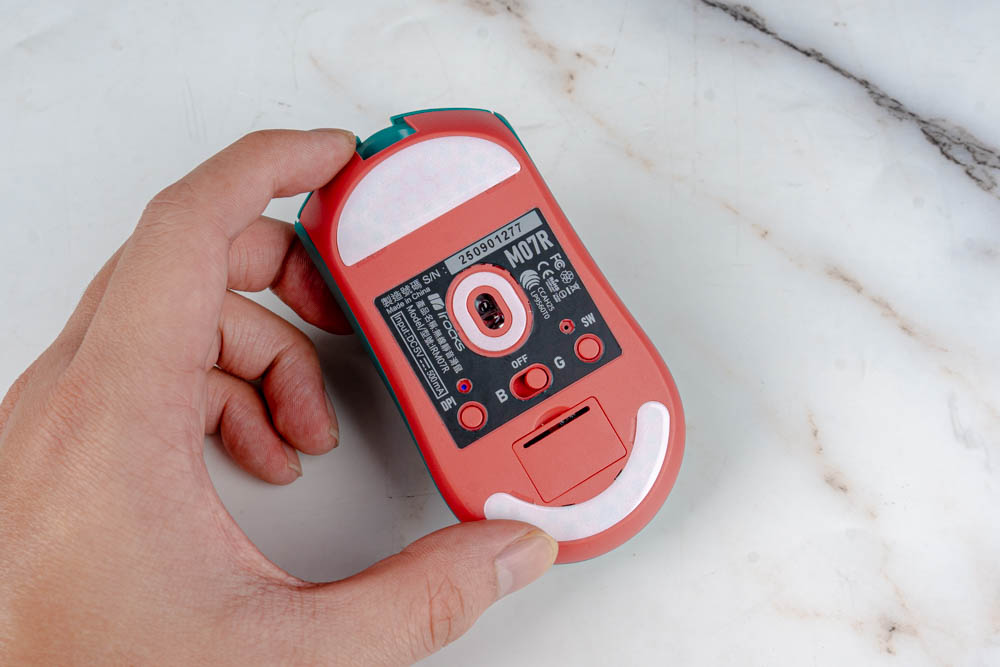 在感應器下方可以看到三組操作鍵,其中包含 DPI 切換、連線模式選擇以及功能切換開關。使用者可以根據需求快速在藍牙、關機或 2.4GHz 無線模式之間切換,也能依照喜好微調滑鼠解析度。滑鼠底部下方還設計了 2.4GHz 接收器的收納槽,外出攜帶時不容易遺失。