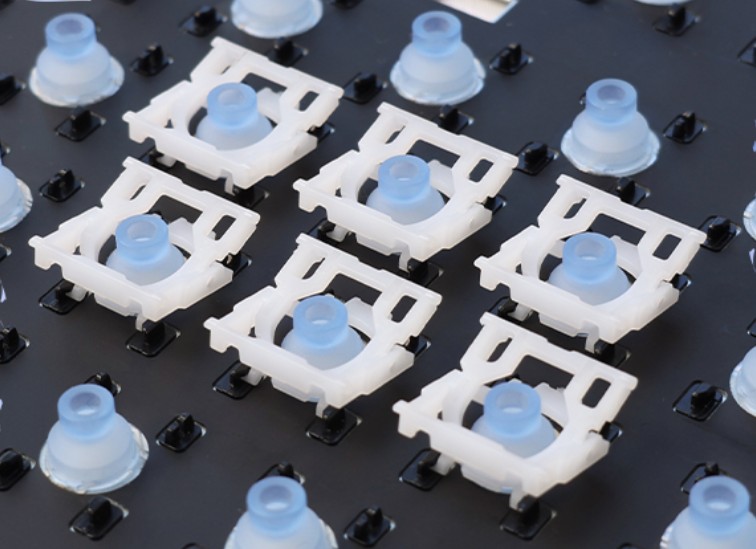 下圖可以看到 K105RP 定位板上方的藍色橡膠帽,主要負責按鍵的回彈與靜音效果。這樣的結構搭配能讓按鍵在敲擊時不僅聲音更小、手感更柔和,也能避免左右晃動,使整體輸入感受更加穩定紮實。