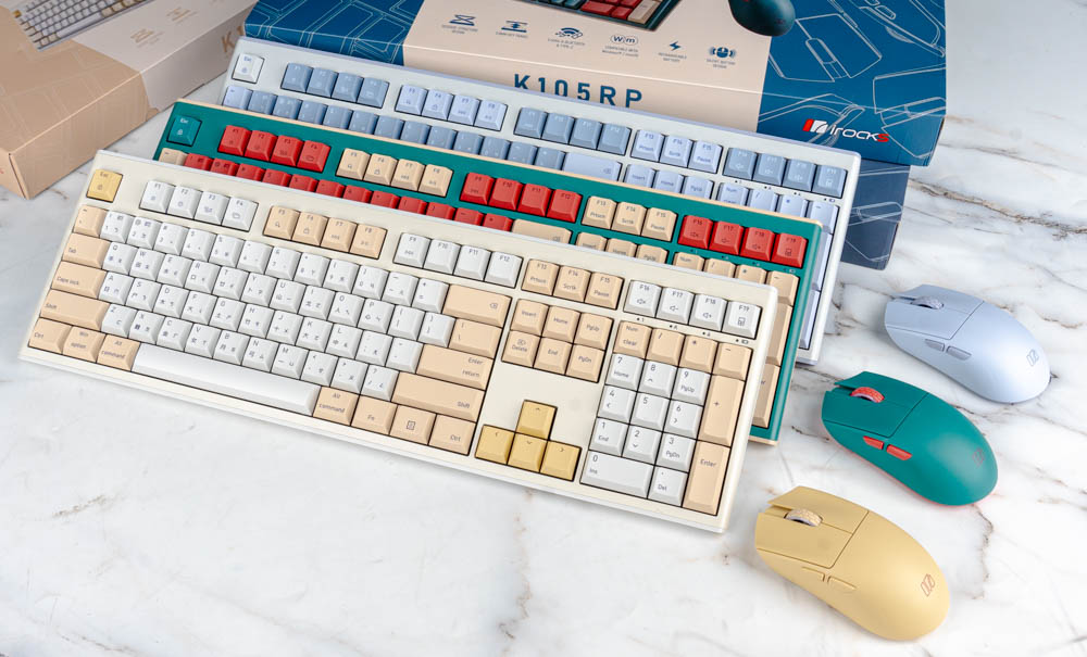 iRocks K105RP 鍵盤共推出三種配色,實體擺在一起時更能看出各自的風格差異。有海松石綠、亞麻晨光、冰川灰藍,三款都各有特色,小編實際看到後覺得每款顏色都相當有質感,難免讓人陷入選擇障礙。最後小編挑選的是帶有節慶氛圍的海松石綠配色,色彩鮮明又活潑,也剛好呼應即將到來的聖誕節氣息。
