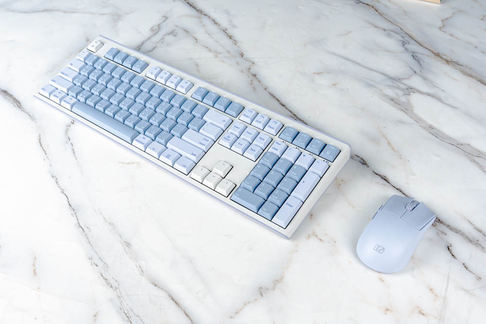 冰川灰藍配色給人的第一印象,就是一種「冷灰黯冰」的靜謐質感。整體以淡藍、霧灰與白色交織而成,像是被薄霧覆蓋的清晨湖面,冷靜卻不失柔和。鍵盤與滑鼠擺在桌面上時,呈現出的乾淨色調非常耐看,也特別符合喜歡極簡、冷色系風格的使用者。