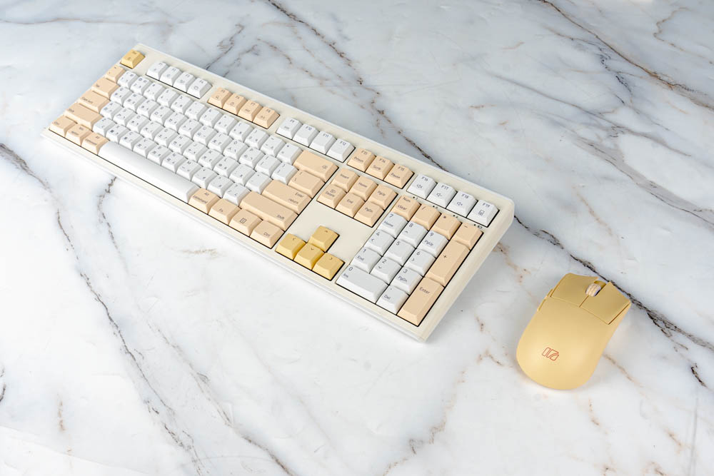 亞麻晨光配色散發出一種「古樸暖光」的溫柔氣息。米黃色與奶白鍵帽交錯排列,就像午後陽光灑落在老木家具上的那種柔和光感,靜靜、暖暖的,沒有張揚的存在感,卻能讓整個桌面氛圍變得柔和而治癒。搭配同色系的滑鼠後更顯和諧,特別適合喜歡溫暖色調、追求舒適視覺感受的使用者。