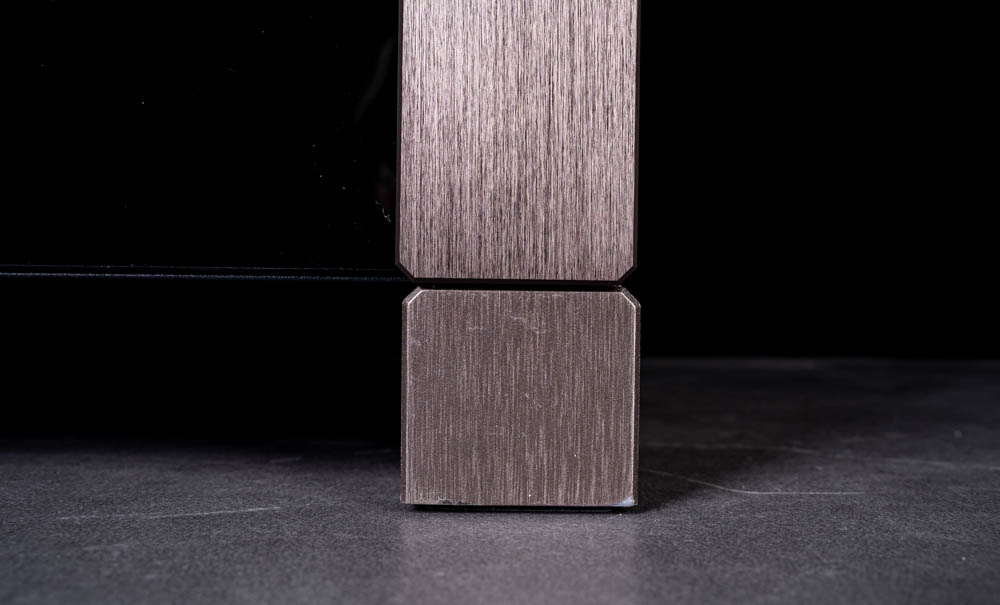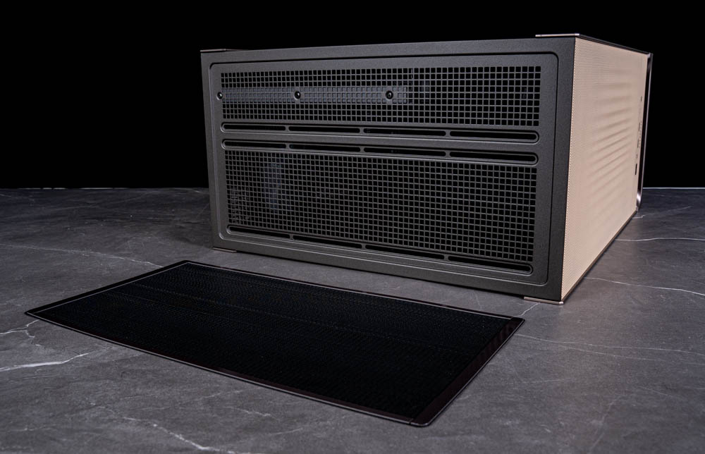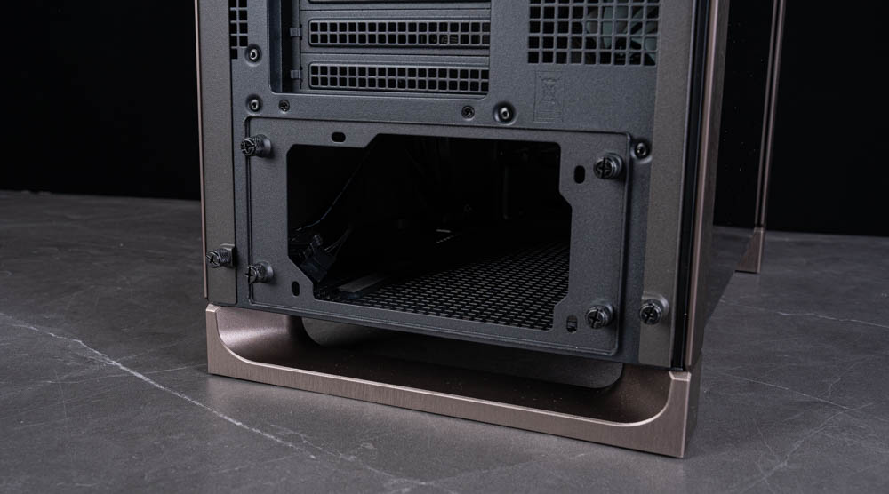 機殼底部同樣採用大面積散熱開孔,並配置磁吸式防塵濾網。值得一提的是,下方的 U 型腳座在細節處理上也相當到位,底部材質雖為塑料,但噴漆配色與鋁質飾條一致,也做了髮絲紋線條讓整體視覺相當協調。