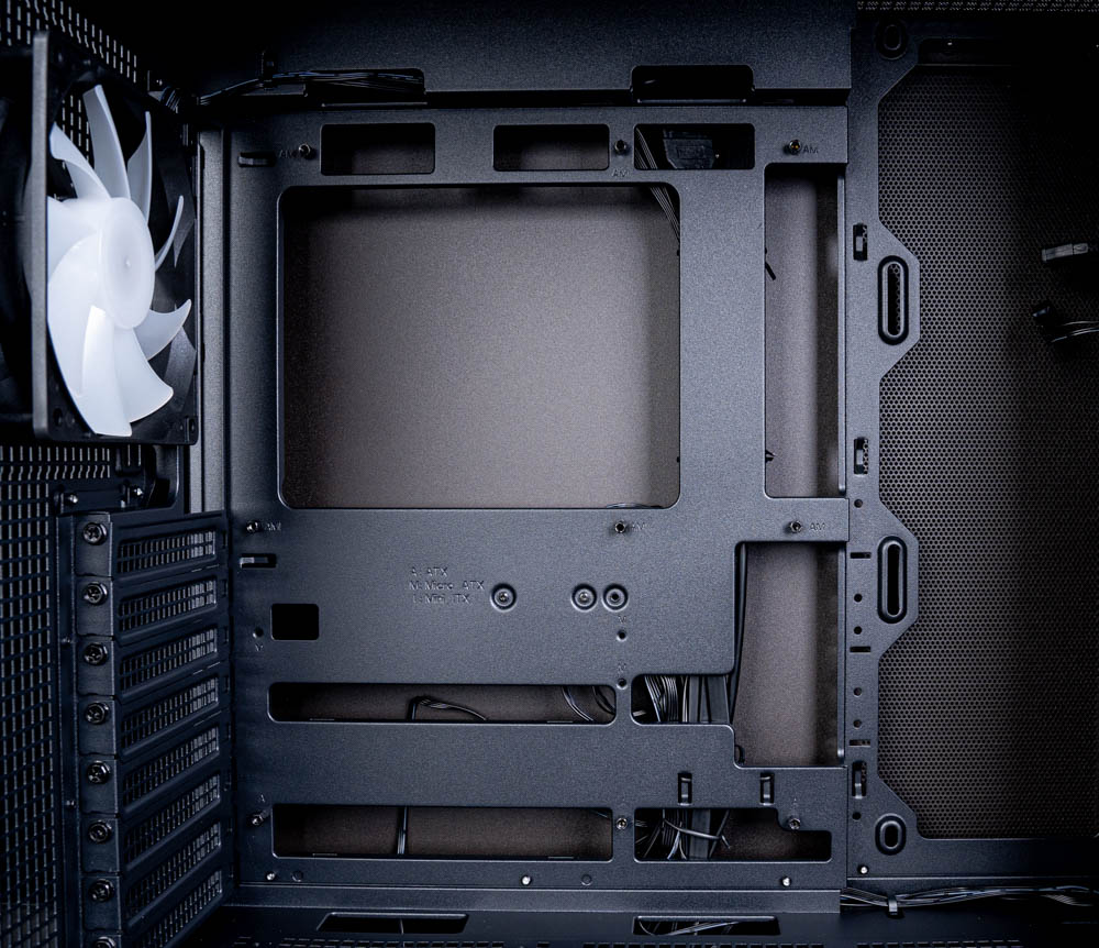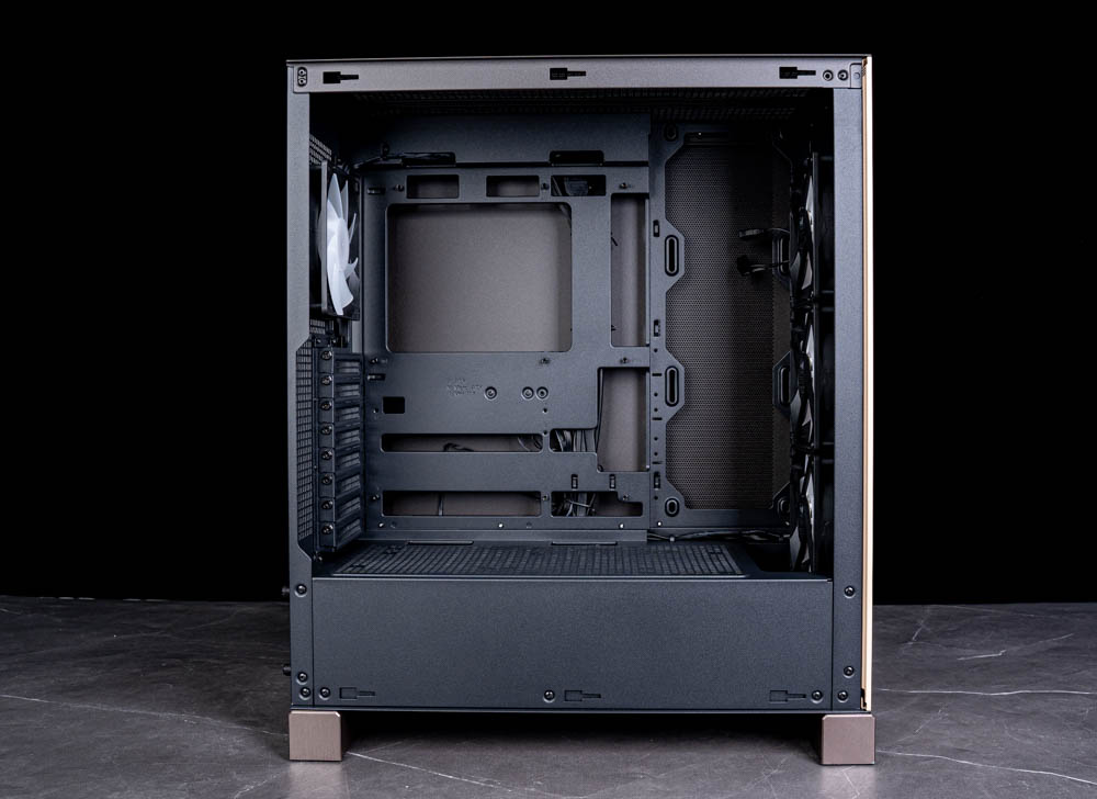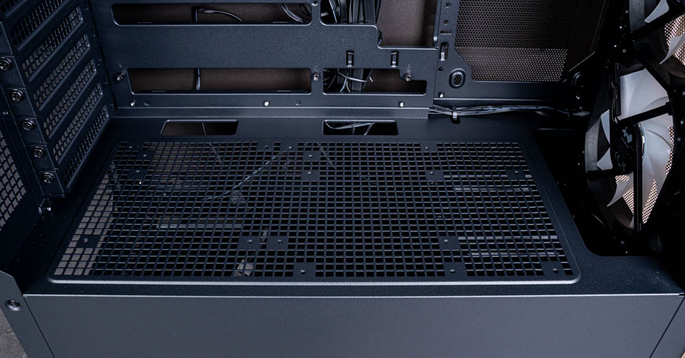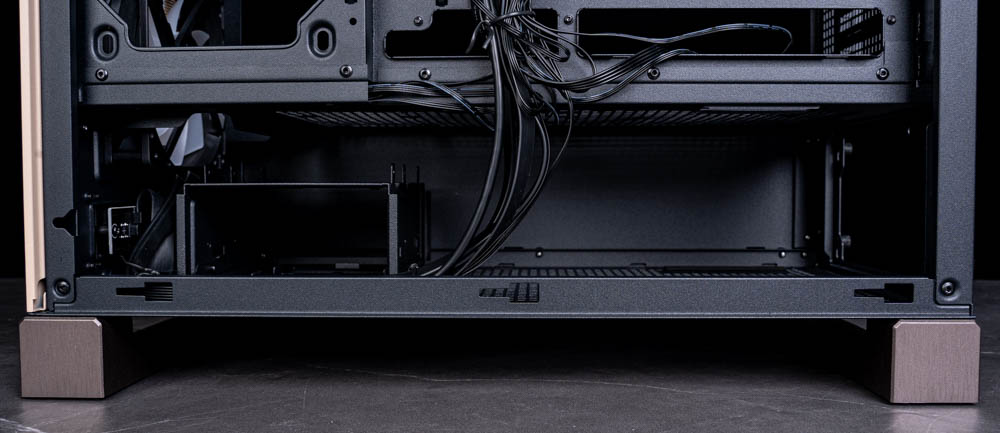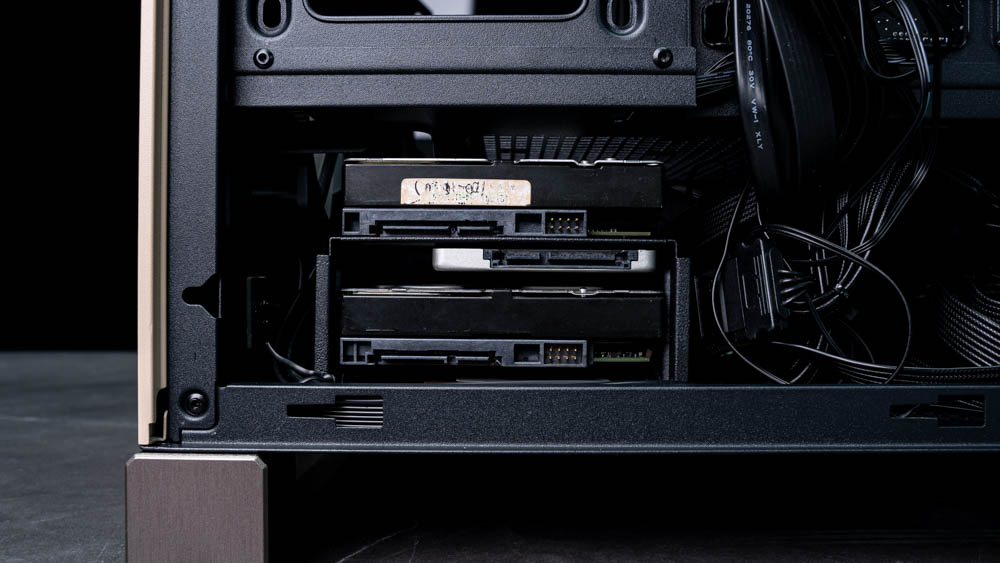 此外,下方電源艙與硬碟架之間也預留了足夠的收納空間,可用來藏放多餘線材,即使使用全模組電源,未使用到的線材也能順利收納其中,不會影響側板闔上,整體整理起來相當輕鬆。