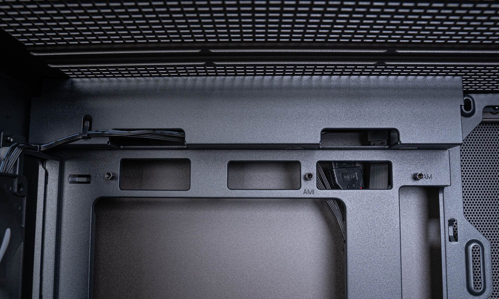 從主機板安裝位上方可以看到,機殼頂部採用凸起式設計,並開設電源走線孔,能有效遮擋線材外露,進一步提升整體視覺整潔度與美觀性;周圍走線孔開口還算寬敞,方便線材穿引與實際組裝。