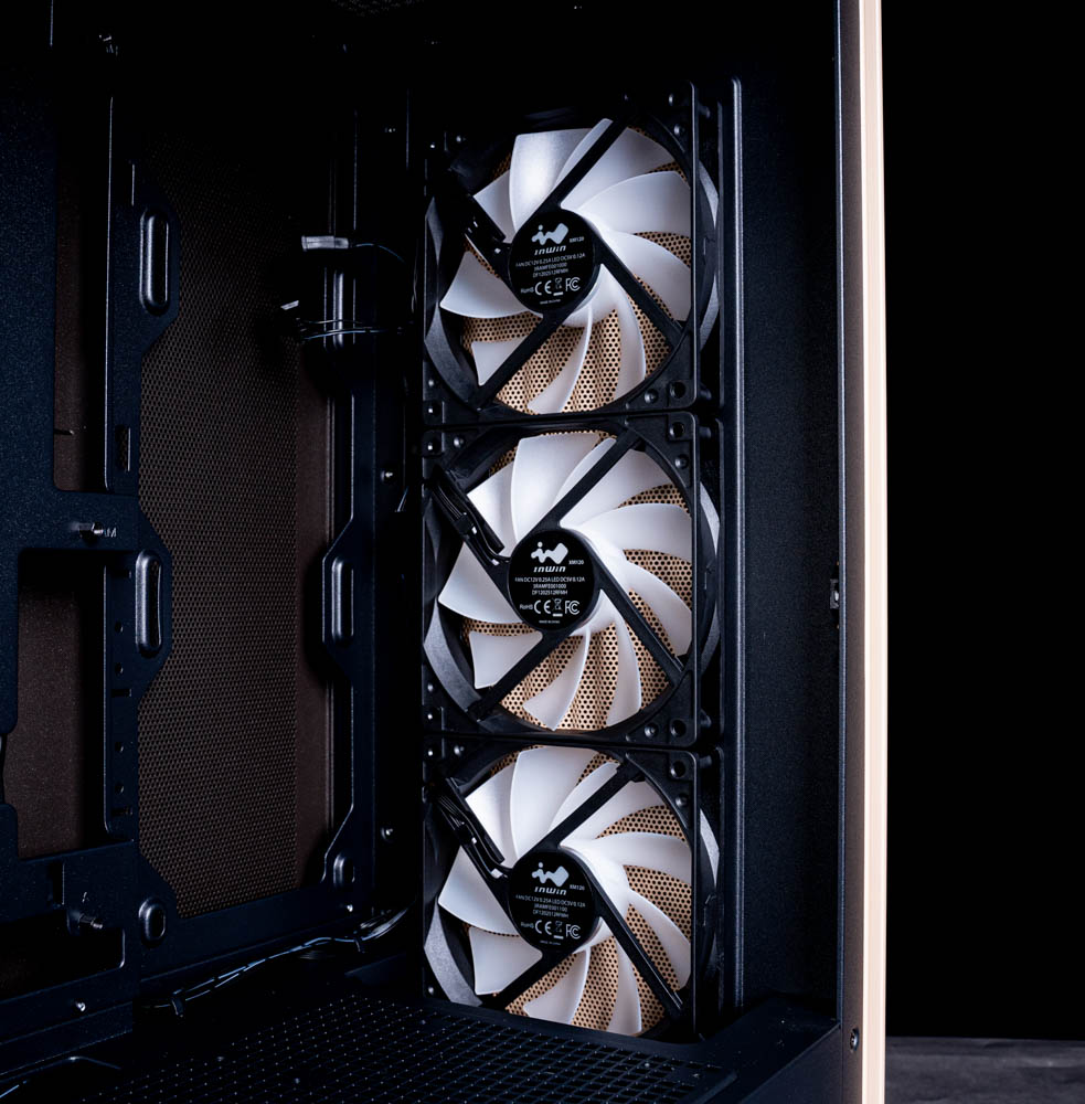 這咖在散熱配置上的規劃相當到位,可以看出迎廣 InWin在風道設計上給了相當充裕的空間。在主機板安裝位左側特別設置獨立風扇架,可支援安裝最多 3 顆風扇,透過增加側邊進風量,讓冷空氣能更直接導入核心硬體區域,進一步強化整體氣流循環與散熱表現。