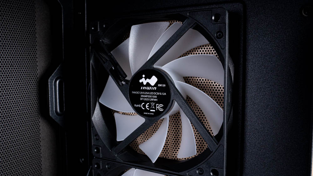 機殼在前方原廠即預裝 3 顆 120 mm 風扇,後方則配置 1 顆同款風扇,採用 9 葉扇設計並支援 ARGB 燈效,最大轉速為 1500 RPM,使用液壓軸承,出廠也已事先協助完成線材整理與接線,能有效節省安裝時間。