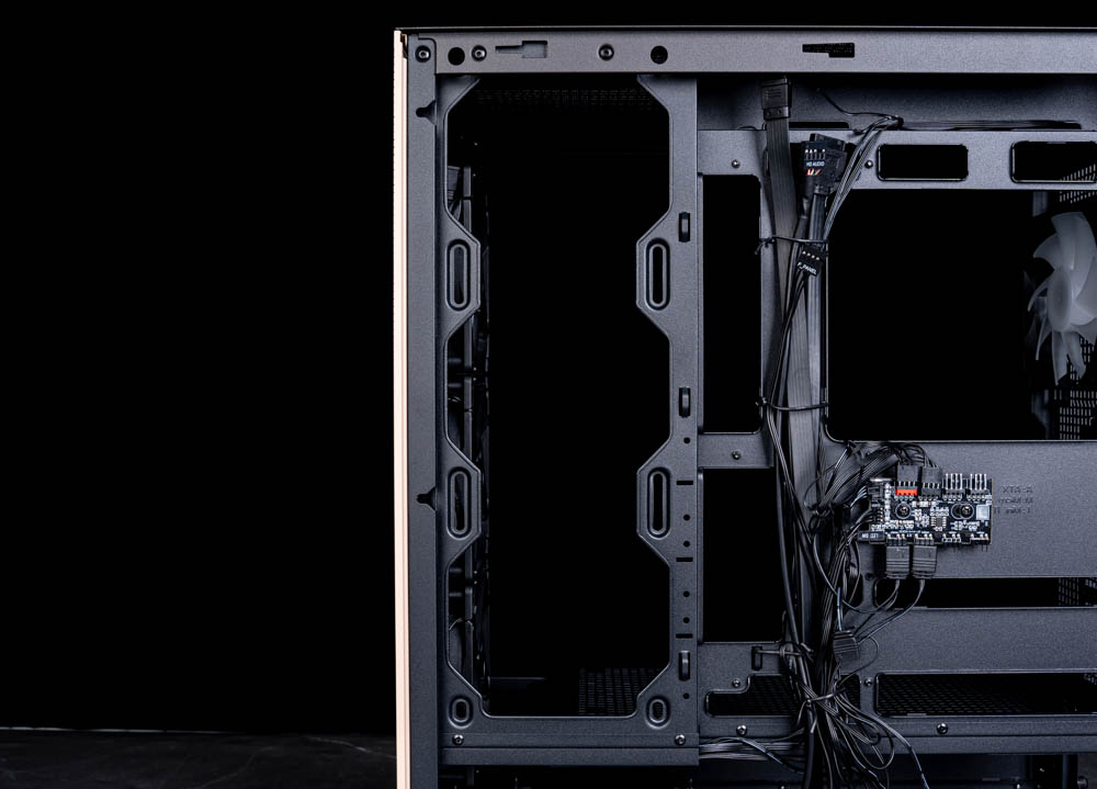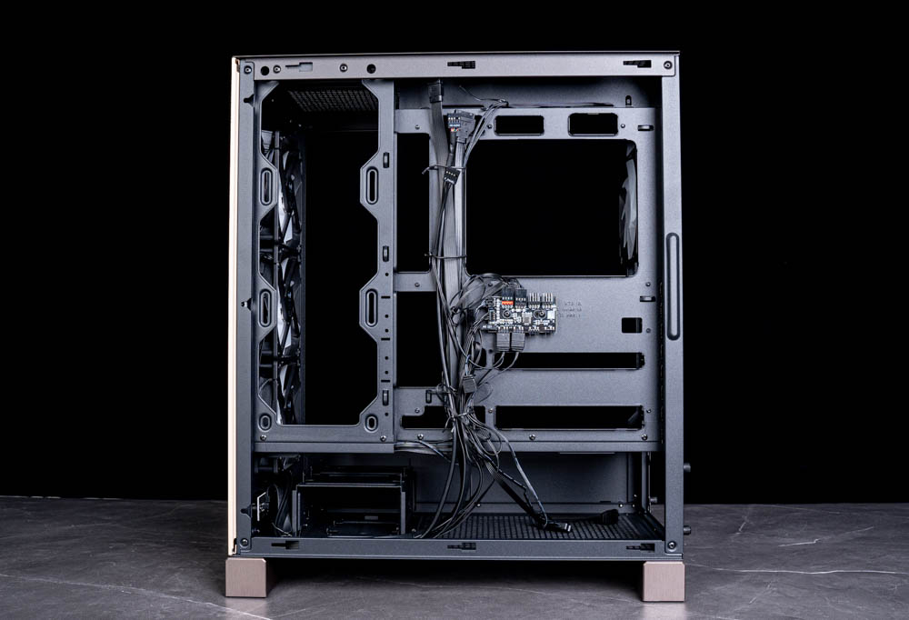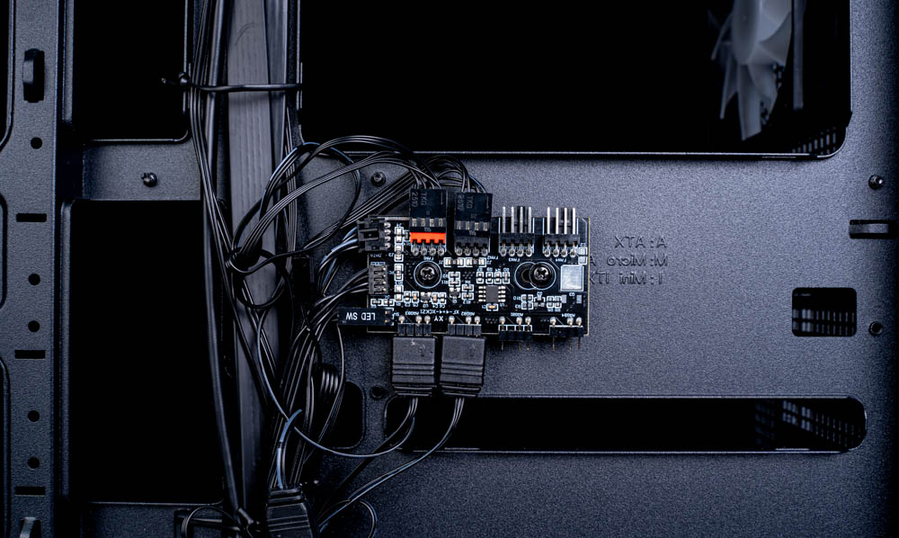 在主機板安裝位置背面,可看到風扇線材皆已預先接至隨附的 PWM/ARGB 集線器,最多可連接 4 組風扇與 ARGB 裝置。完成接線後,可透過前置 I/O 面板的燈效切換按鈕直接變換燈效,亦可長按切換為主機板同步模式
