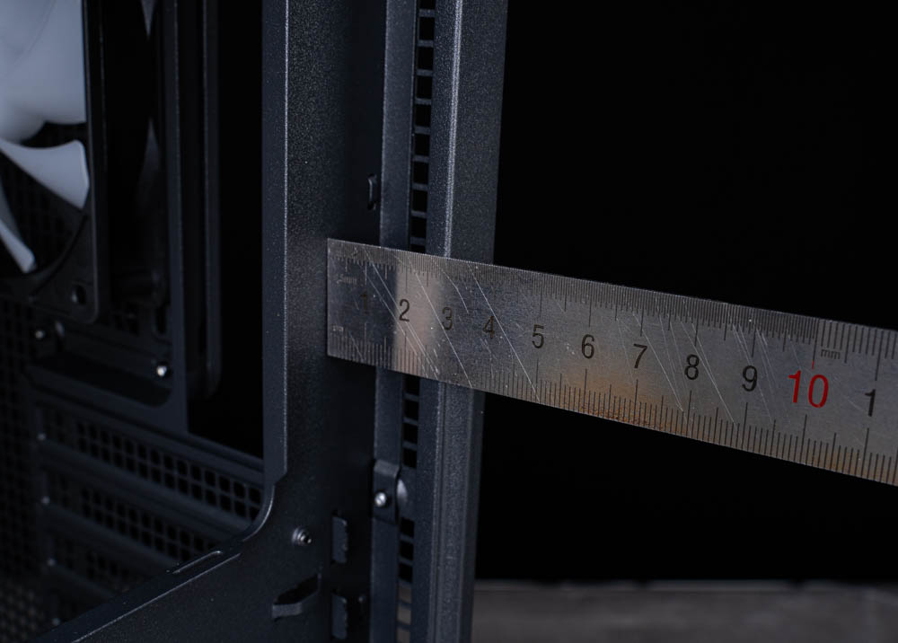來到機殼右側內部,可以看到背部的理線空間還算寬敞,主要走線區域預留了足夠的深度約 25 mm,對於 24pin、PCIe、CPU 供電線等較粗的線材都能收納,不會覺得壓迫。