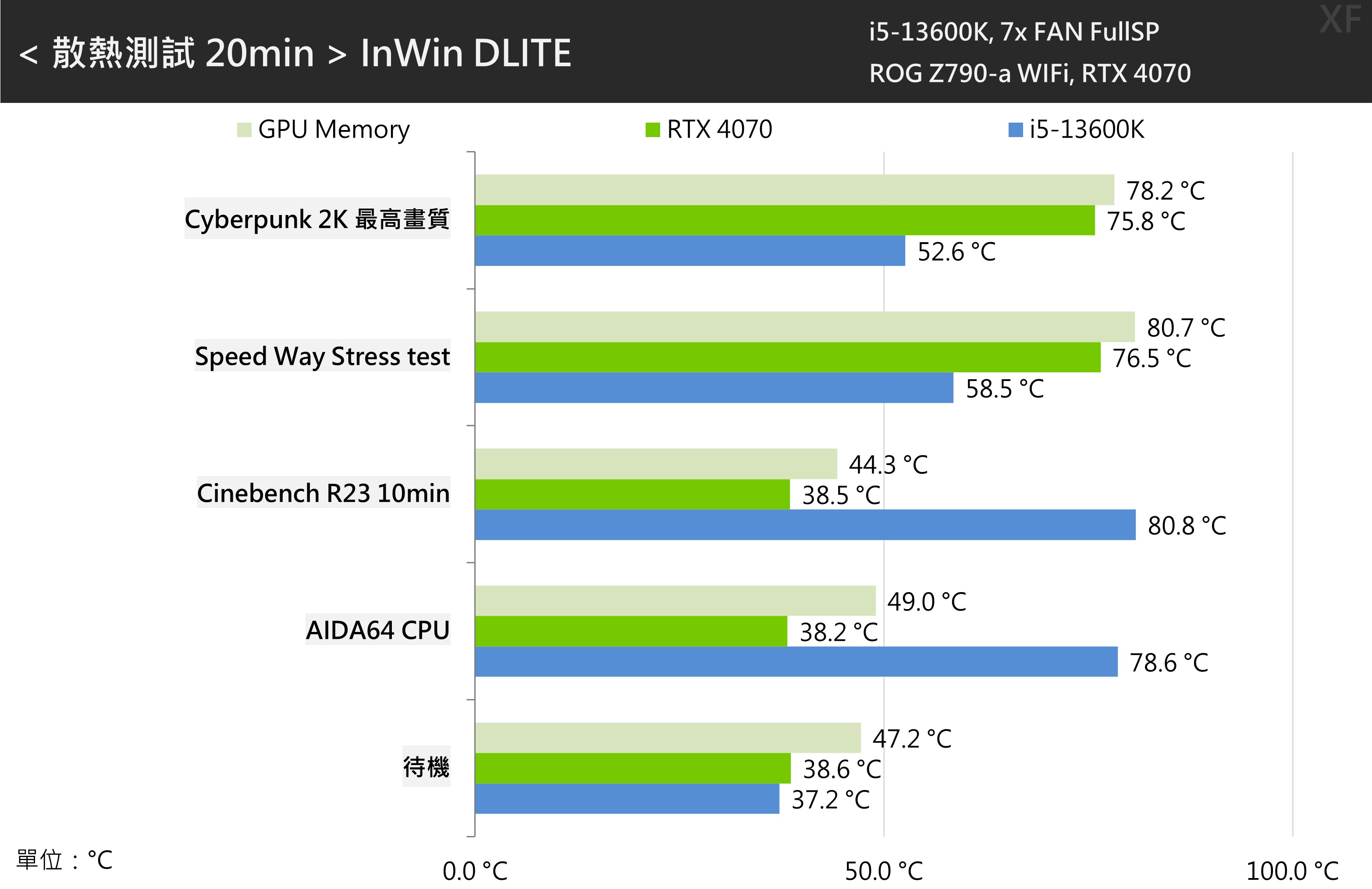 測試使用了 INTEL i5-13600K 處理器搭配 ROG Z790-A WIFi主機板,顯示卡則是公版的 RTX 4070,在Windows 11的環境下測試,處理器使用預設設定並將風扇調為全速,並使用HWiNFO紀錄二十分鐘的平均溫度。