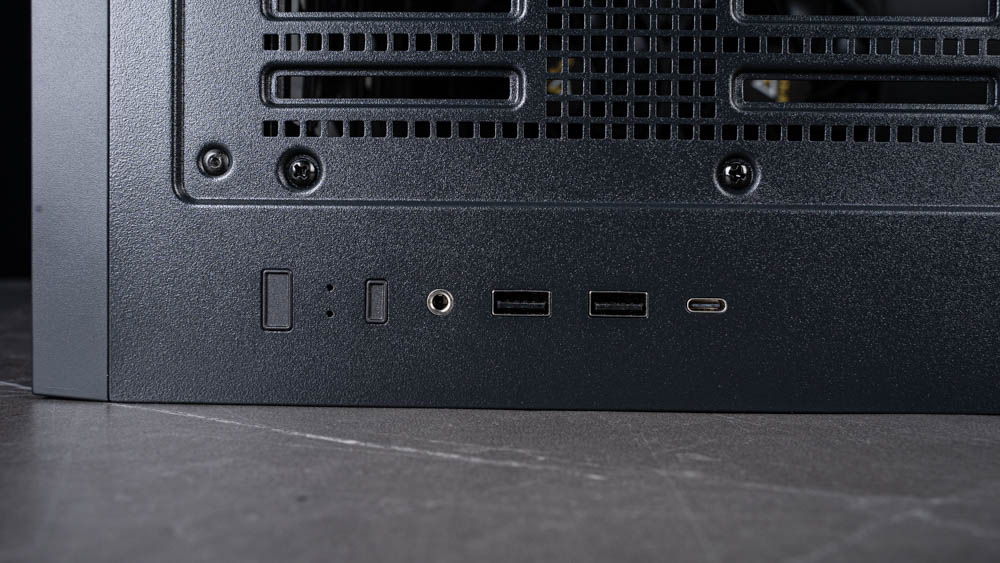 在機殼頂部設有 I/O介面,由左至右依序為電源開關、重啟鍵、音源複合孔、雙 USB 3.0,以及一組 USB Type-C,日常使用相當夠用。
