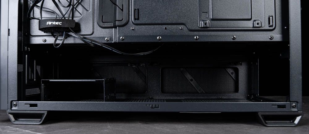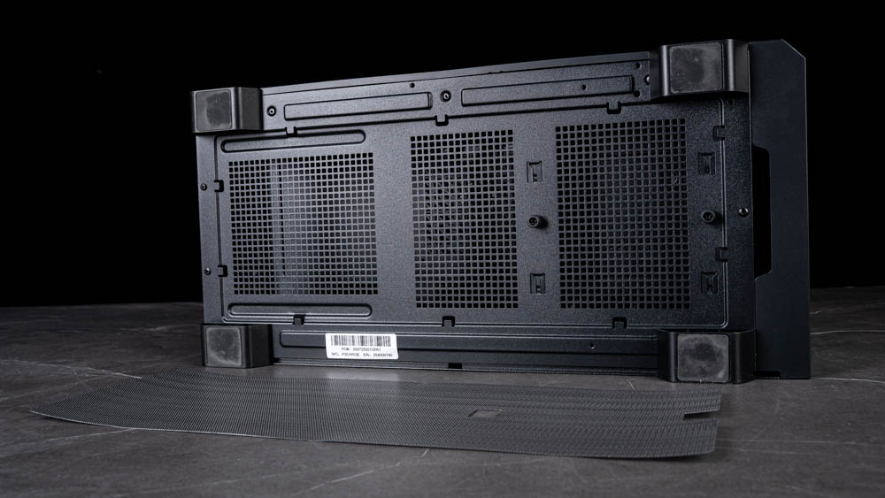 在機殼底部可看到四個加高腳座設計,與桌面之間約保留 1 cm 的高度空間,有助於底部進風與整體散熱表現。
