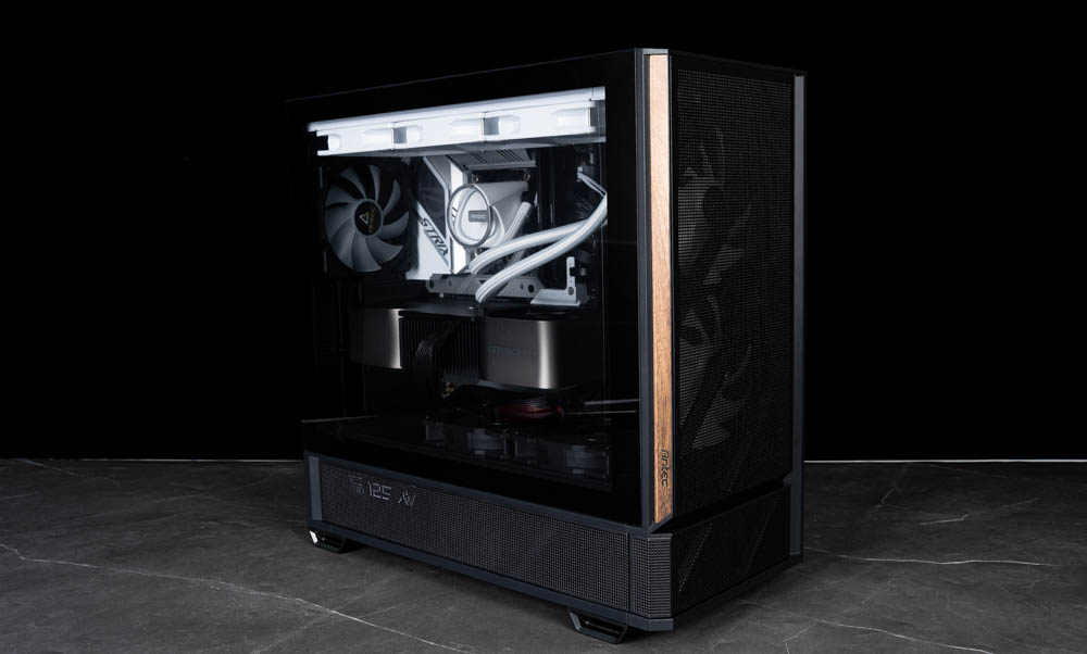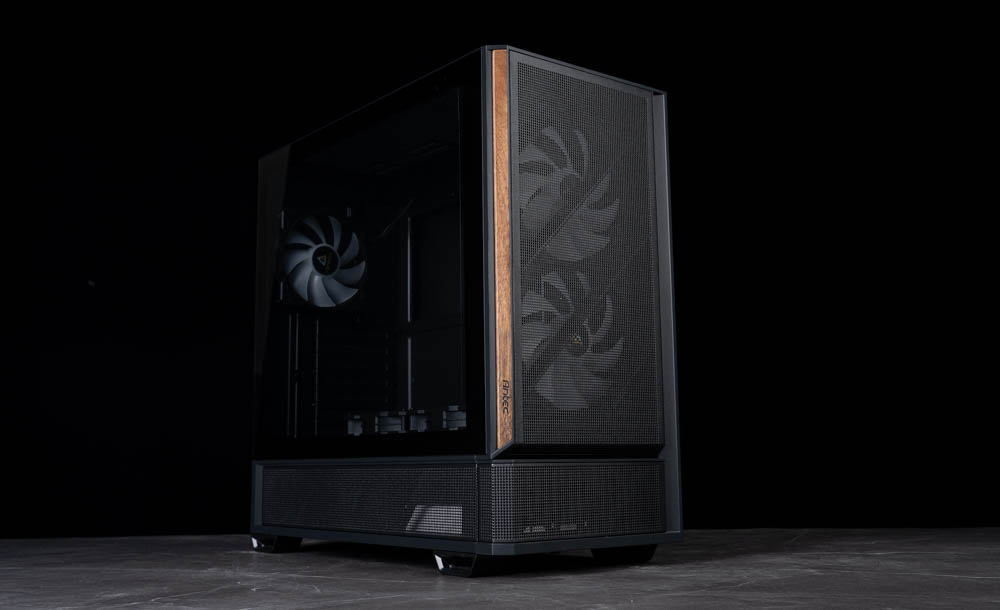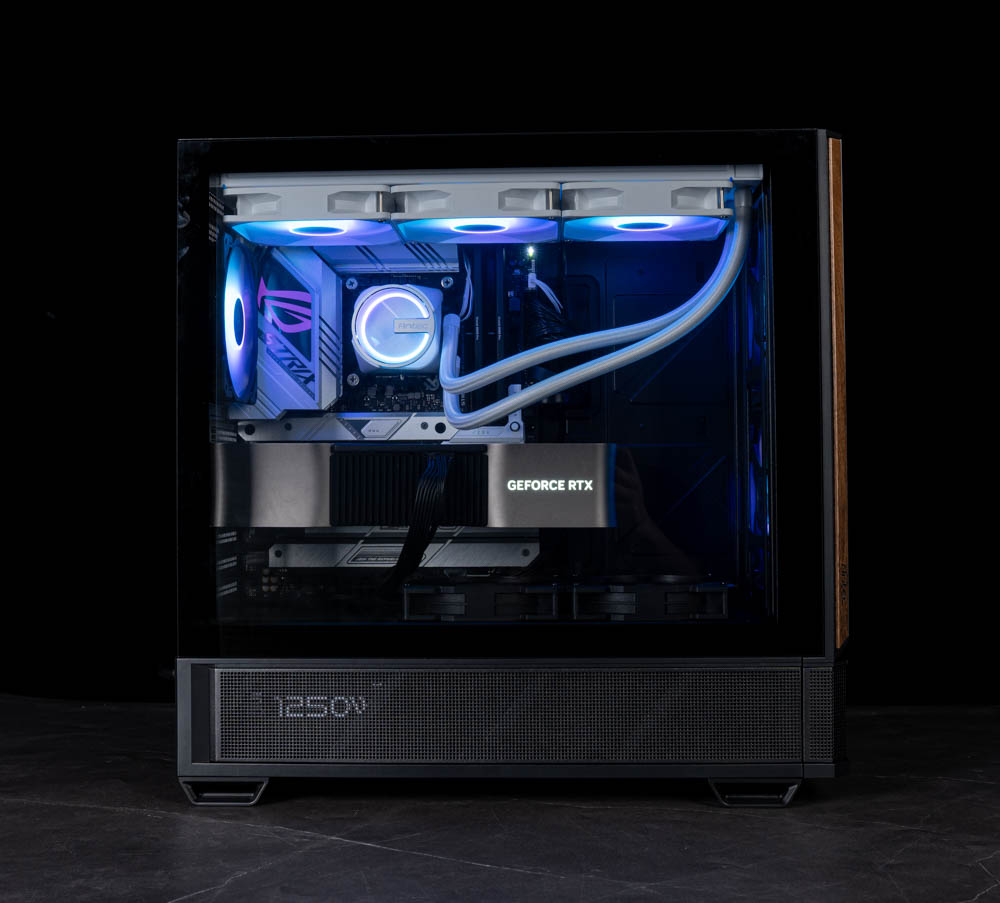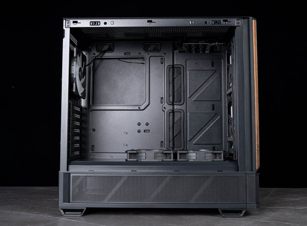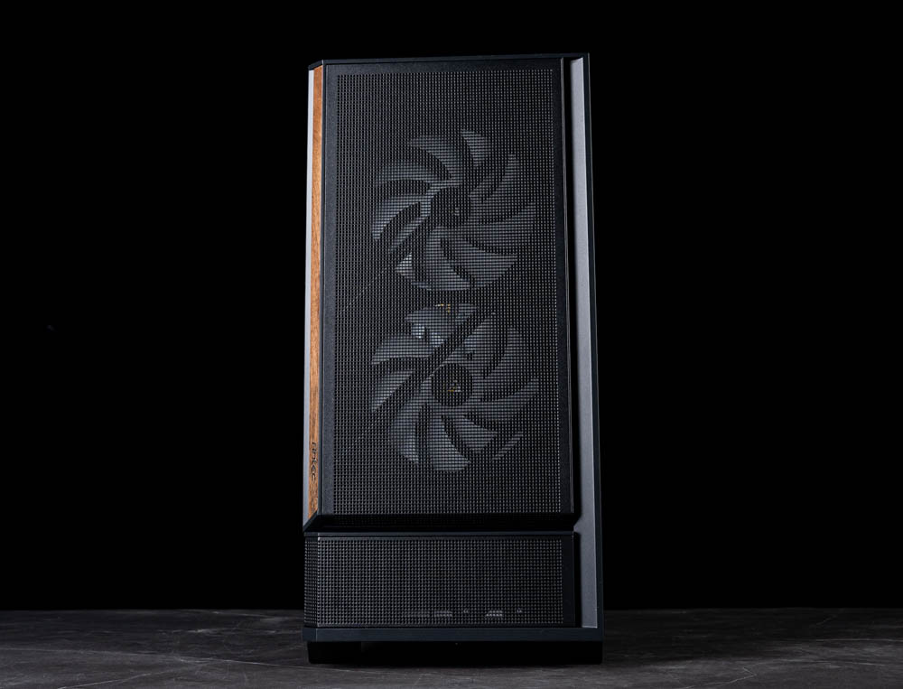 外觀方面,前面板加入木紋裝飾與倒角設計,為偏性能取向的機殼增添質感層次,成功跳脫傳統全黑高風量機殼的單調印象;在組裝體驗上,雖然背側理線與頂部穿線空間略顯緊湊,但這樣的取捨主要是為了換取對高階顯示卡的相容性以及大型塔型散熱器的安裝空間,整體而言仍屬合理的設計取向。