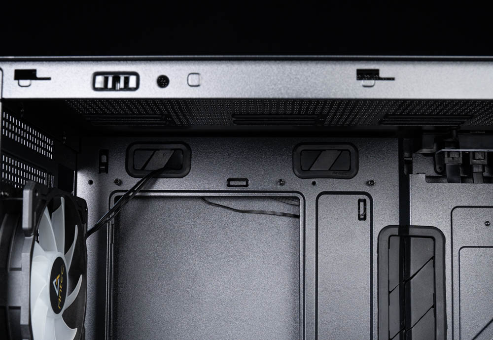 ↑ 主板安裝位上方與右方的走線開孔都有裝理線膠套。