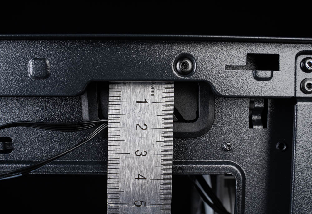 為了滿足現代高階硬體配置需求,這款偏中小型的中塔機殼在空間配置上,主機板上方的可用空間相對受到壓縮。上方走線開口尺寸本身偏小,又加裝橡膠護圈以提升整體美觀,實際口徑約為 1.8 cm,因此在安裝 CPU 供電線時,需要先調整好線材角度再進行插入,組裝過程中需稍微留意。