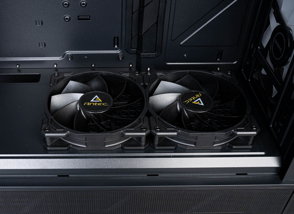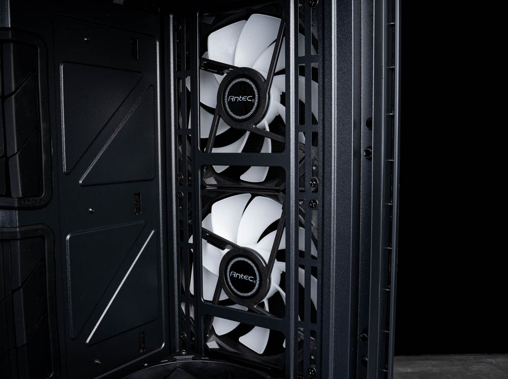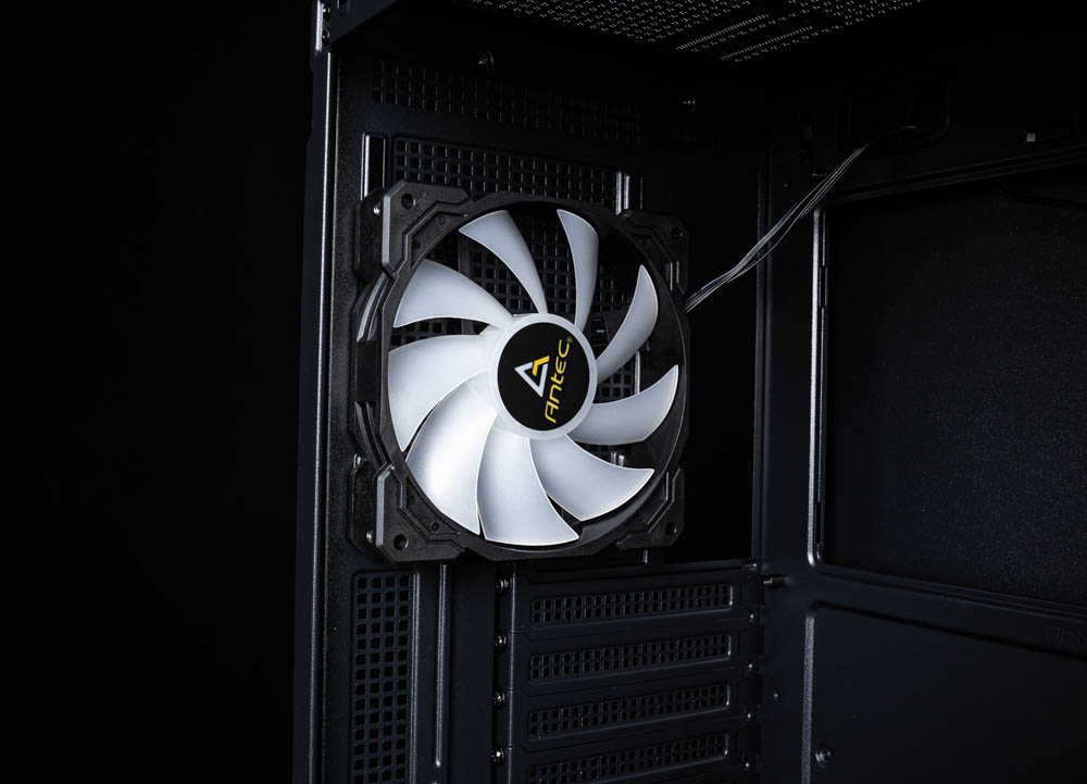 在風扇配置方面,Antec 的誠意相當充足,P30 ARGB 出廠即預裝五顆風扇,包含前方兩顆 140 mm ARGB 進風風扇、電源艙上方兩顆反向葉風扇,以及後方一顆 120 mm ARGB 排風風扇。在原廠風扇配置已相當完整的情況下,玩家可將預算集中投入於一體式水冷,無須再為風扇額外支出。