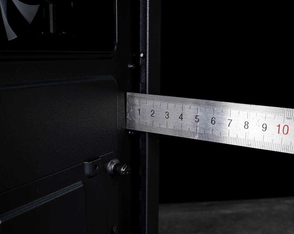 機殼左側配置厚度為 4 mm 的鋼化玻璃側板,並支援快拆設計,可直接展示內部硬體配置與風扇燈效;右側則採用鋼板側蓋設計,需透過手擰螺絲進行拆卸。