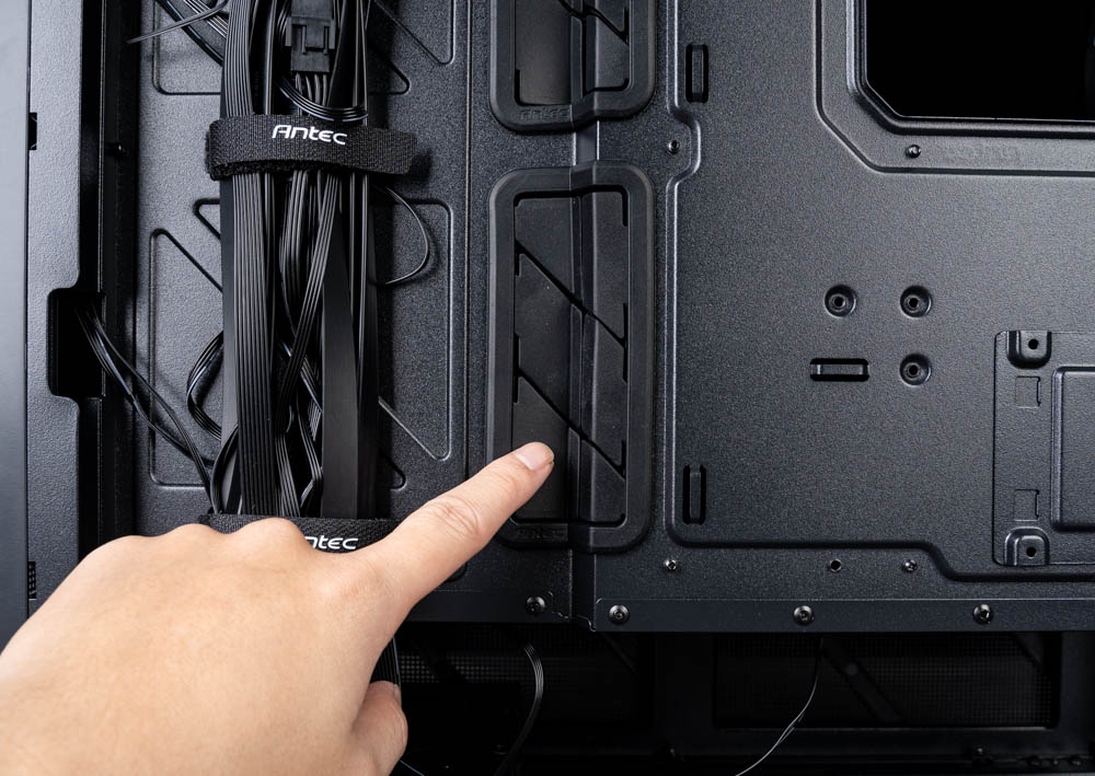 在理線空間左側設有三條束線帶,方便將線材集中整理與固定;而在主機板安裝位旁則配置橡膠護圈,能在走線時提升整體理線的整潔度。
