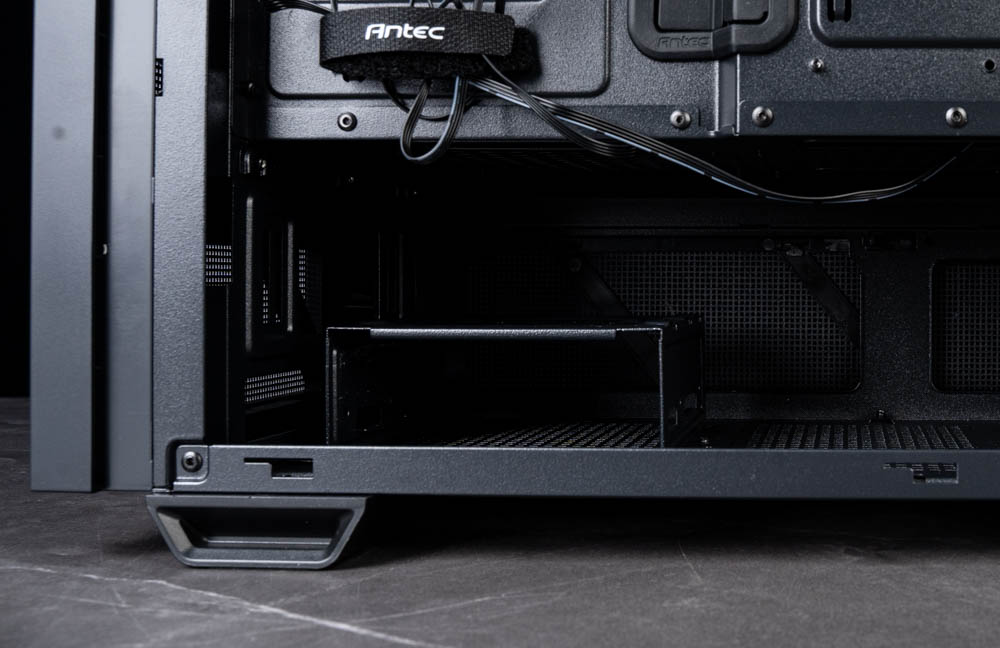電源艙外側同樣採用散熱網孔設計,有助於從機殼底部導入冷空氣,進一步強化整體進風效率。電源艙與上方前面板的網孔邊緣皆加入倒角處理,使視覺層次更為立體,同時也為整體外觀增添幾何美學元素。