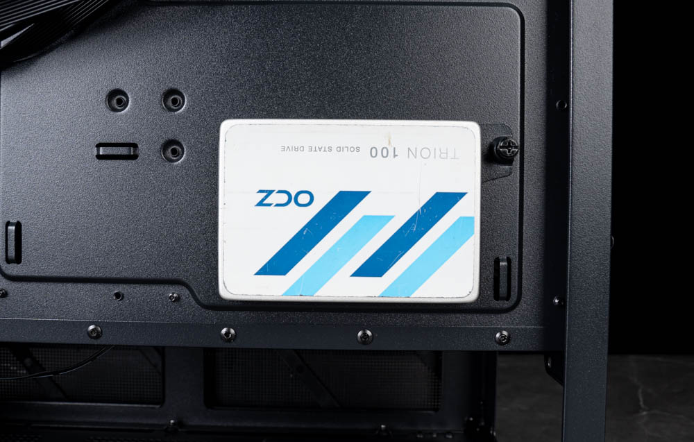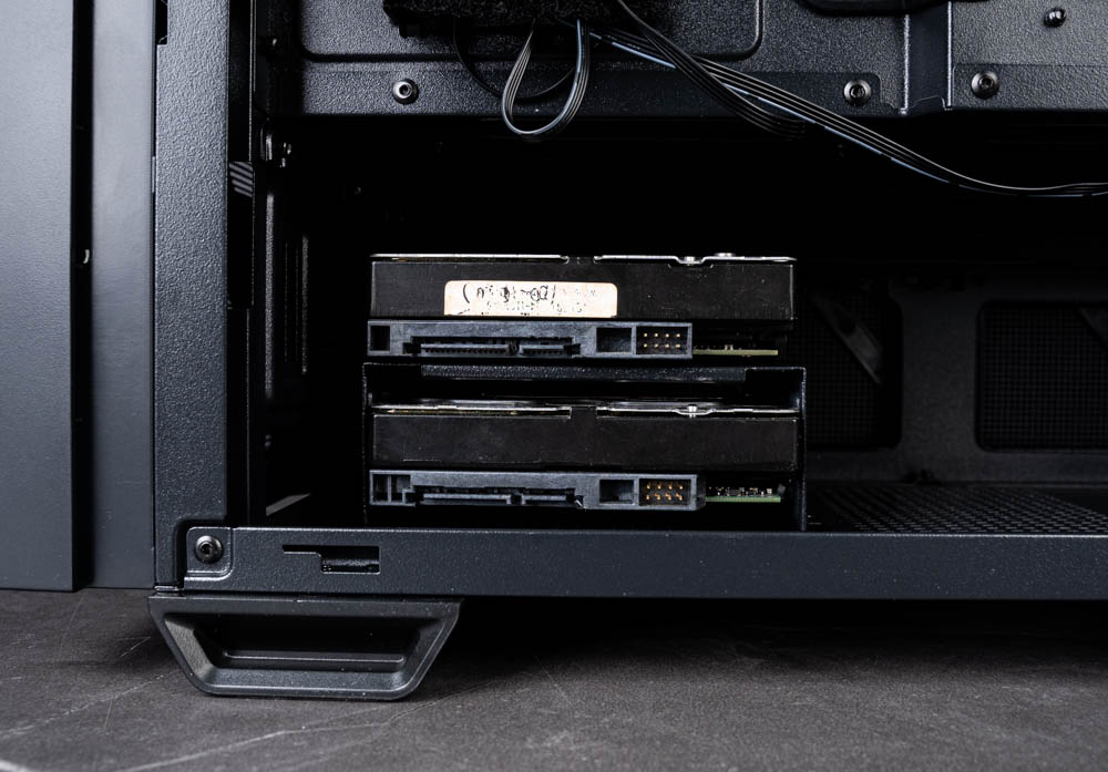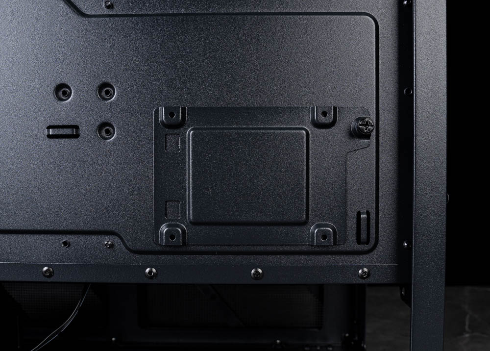 在電源艙內部設有一組硬碟架,可安裝最多兩顆 3.5 吋 HDD,或是一顆 3.5 吋 HDD 搭配一顆 2.5 吋 SSD。此外,在主機板安裝位背面下方,另配置一處 2.5 吋 SSD 硬碟安裝支架,可再額外安裝一顆 2.5 吋 SSD,提供彈性的儲存擴充空間。