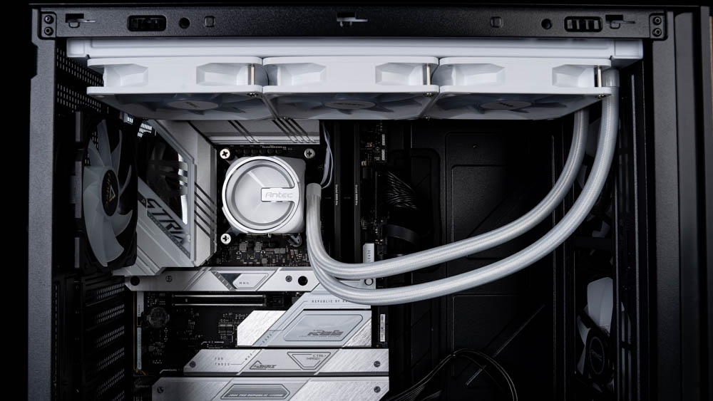 在完成主機板與線材安裝後,小編接著將 Antec 近期推出的 Skeleton 360 mm ARGB 一體式水冷安裝於機殼頂部,實際搭配 P30 ARGB 的空間與相容性表現,後續也會另行整理一篇水冷開箱文,與大家分享更詳細的安裝與使用心得。