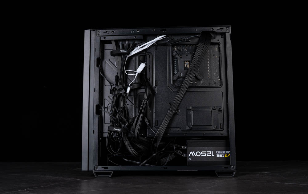 在理線空間同樣受到影響,主機板背側預留的走線深度約為 1 cm。像是 24-pin 主電源線、CPU 供電線或多餘線材,在收納時建議選用線徑較不厚重、柔軟度較高的線材,組裝過程會相對順利。所幸電源艙空間相當充裕,可將多餘線材整理後集中收納於其中,對整體理線仍保有一定彈性。