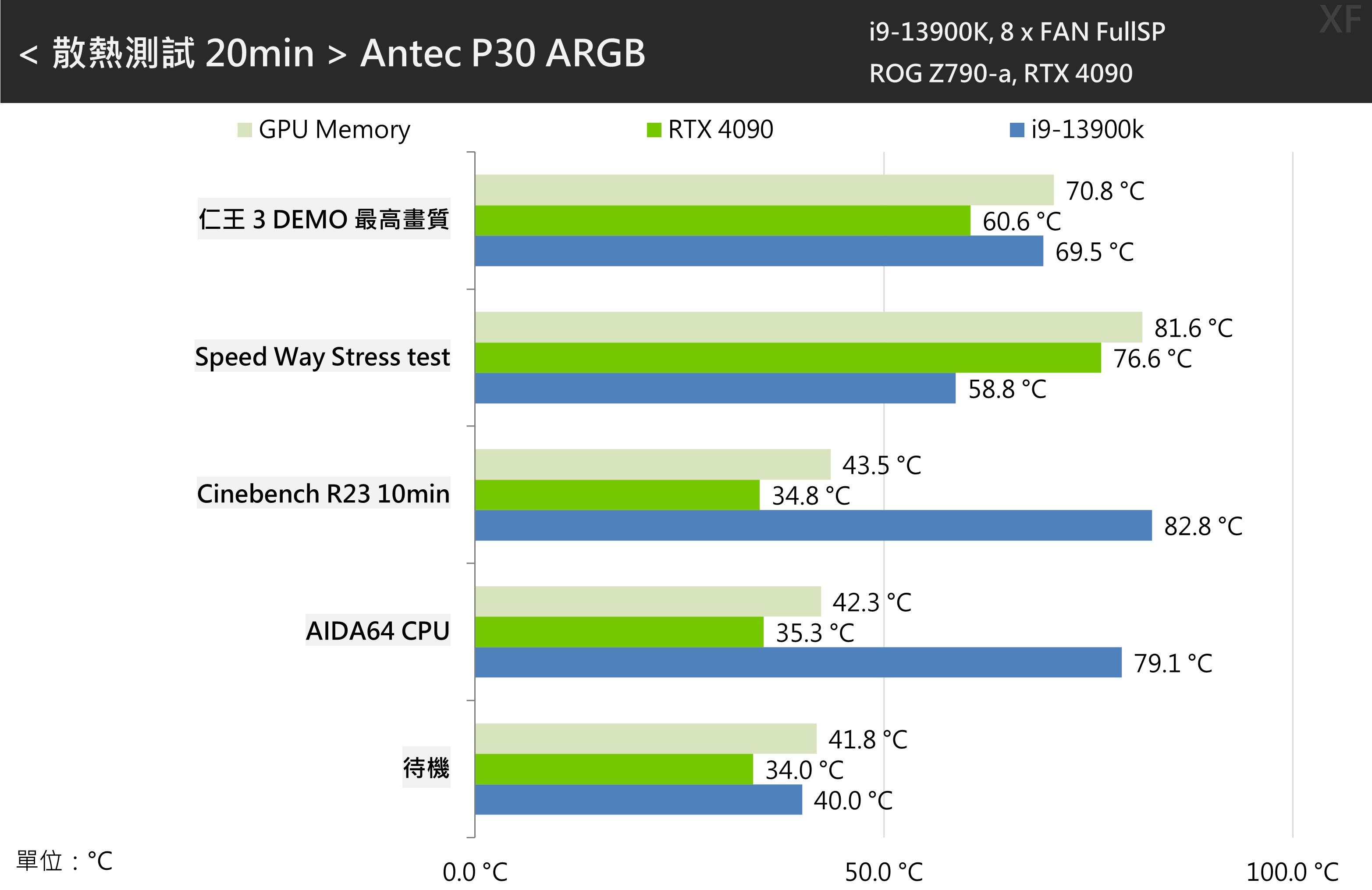 散熱測試使用了 intel i9-13900K 處理器搭配 ROG Z790-a WIFi主機板,顯示卡則是公版的 RTX 4090,在Windows 11的環境下測試,處理器使用預設設定並將風扇調為全速,並使用HWiNFO紀錄二十分鐘的平均溫度。