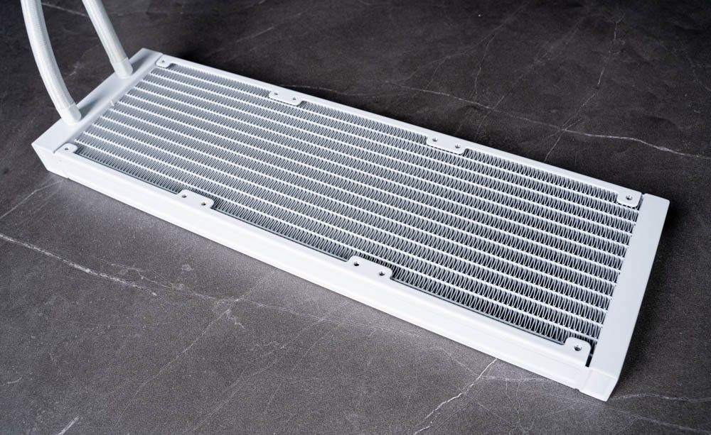 Skeleton 360 ARGB 水冷排採用鋁製材質,整體厚度為 27 mm,內部搭載高密集的散熱鰭片,排列整齊且間距均勻,有助於提升整體熱交換效率;水管採用耐用編織管線設計,可有效防止外部物理損傷,延長使用壽命。