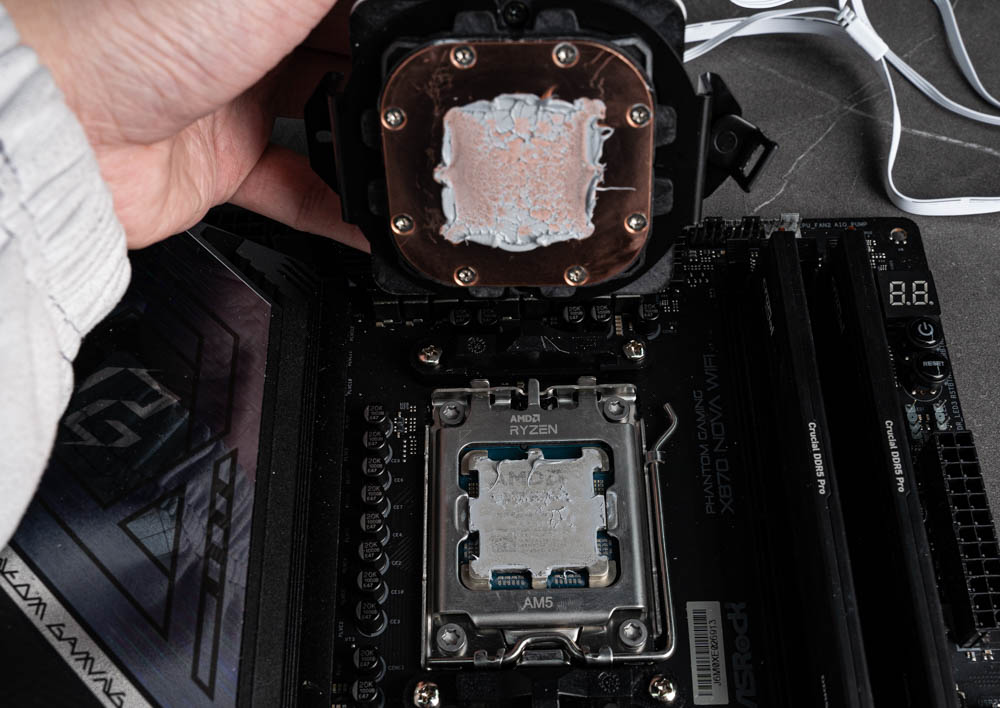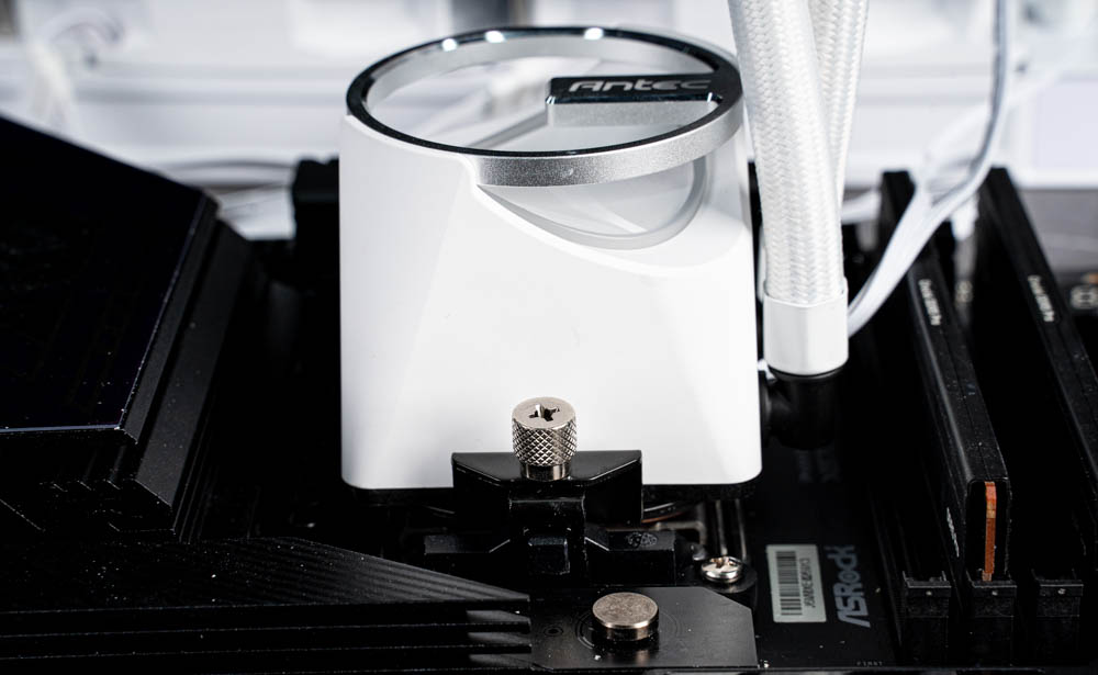 Skeleton 360 ARGB 在 AMD 平台上的安裝流程相對簡單,無需更換主機板原廠扣具,只需將水冷頭更換為 AMD 固定支架後,對準原有卡扣位置鎖緊即可完成安裝。