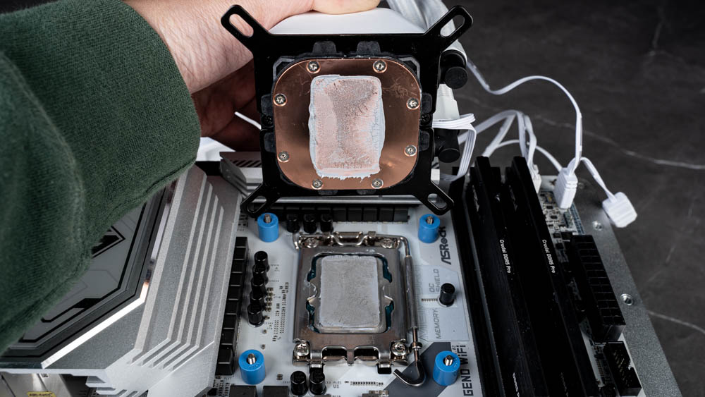 接著將 Intel 水冷頭固定支架嵌入於水冷頭本體,完成後對準固定背板的螺柱,並以對角方式依序鎖上四顆支撐螺絲,確保受力平均並固定牢靠。完成支架安裝後,即可完成 Skeleton 360 ARGB 水冷散熱器於 Intel 平台的組裝。