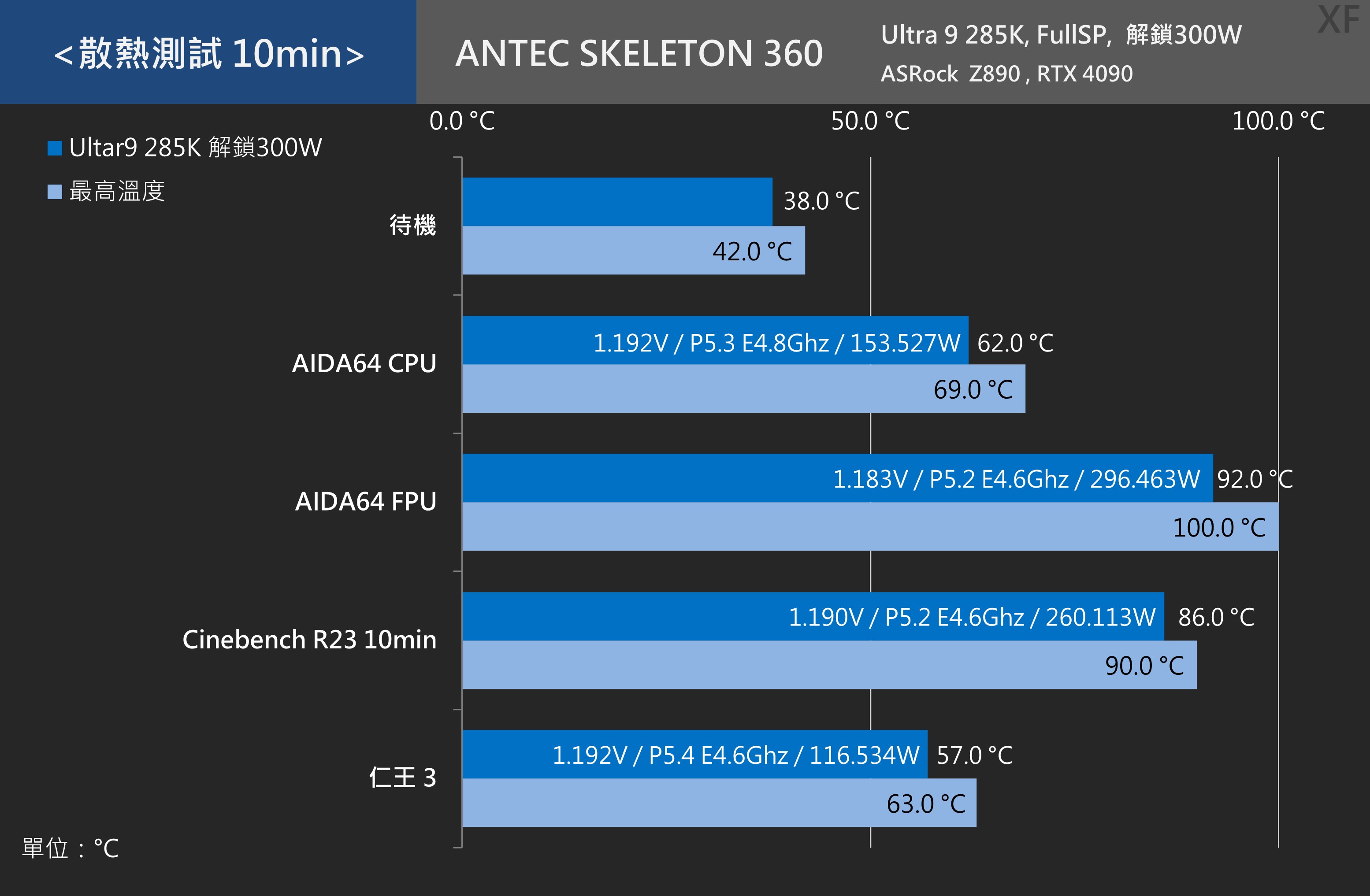 測試環境:開放式主機架、BIOS ( 風扇&水泵全速 / P1、P2 解鎖300W )