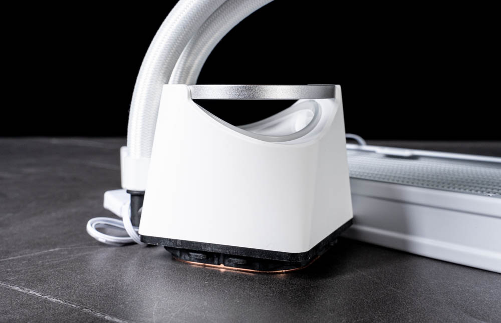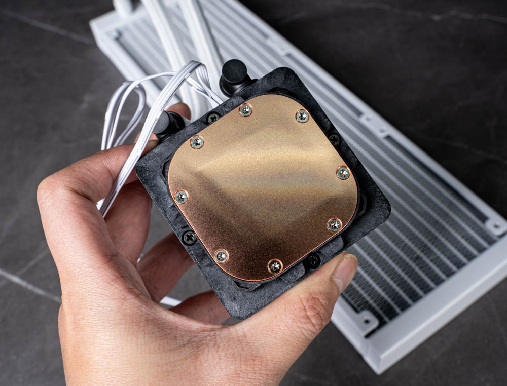 從側面角度來看,Skeleton 360 ARGB 的水冷頭造型更能體現其獨特設計。機身線條採用由上而下延伸的梯形輪廓,進而形成不規則圓形的光圈,使燈光在不同角度下呈現出變化感,為整體視覺增添層次,而非單一、固定形狀的發光效果。