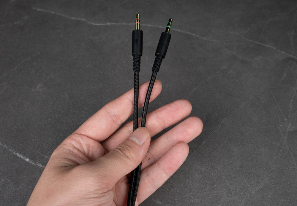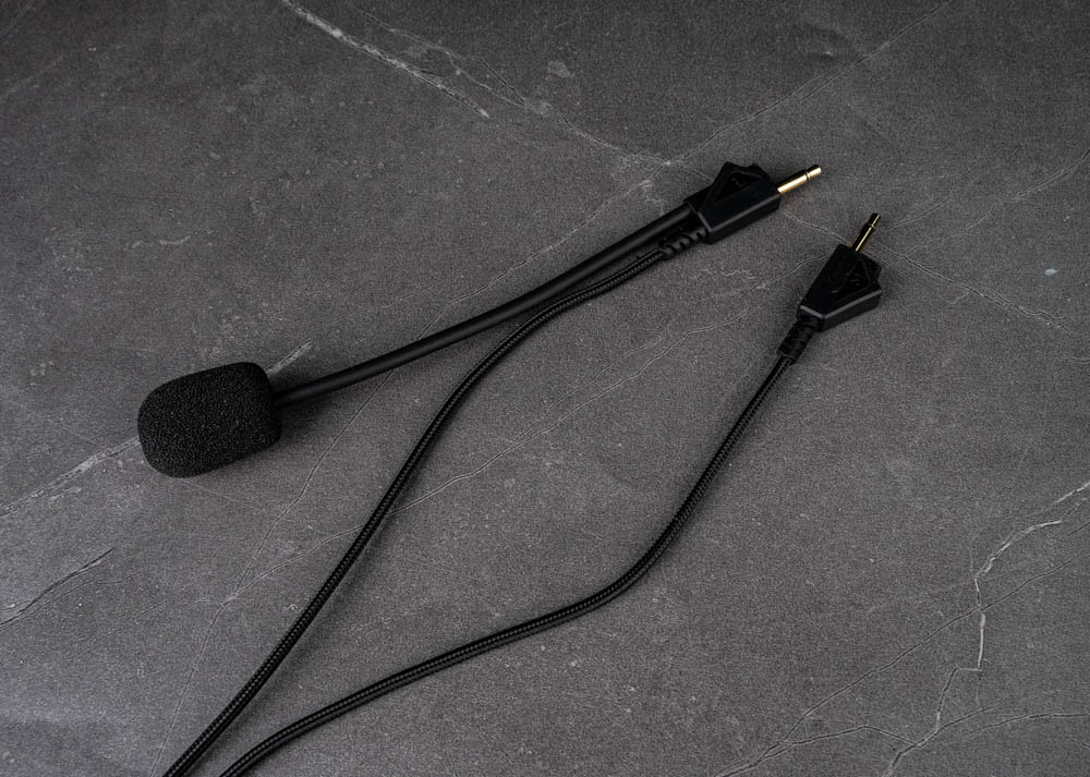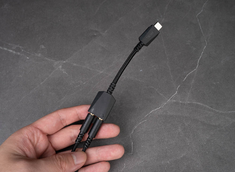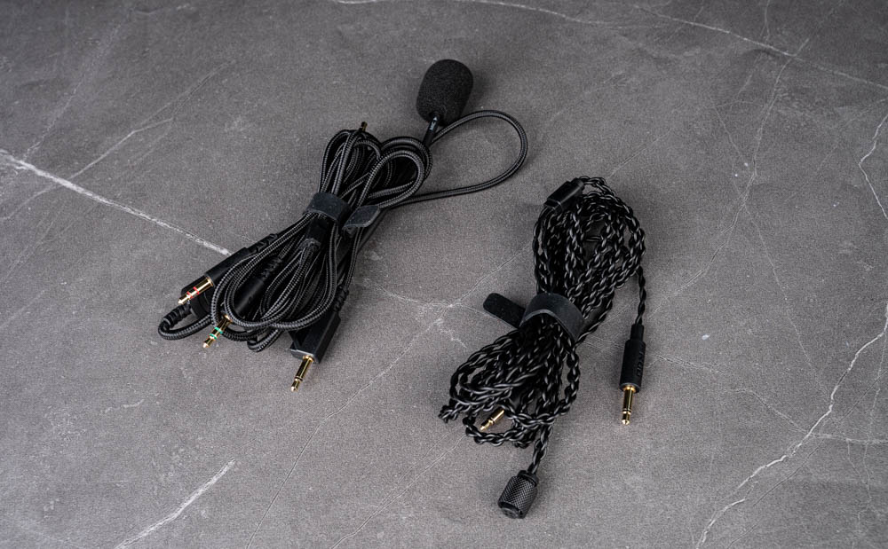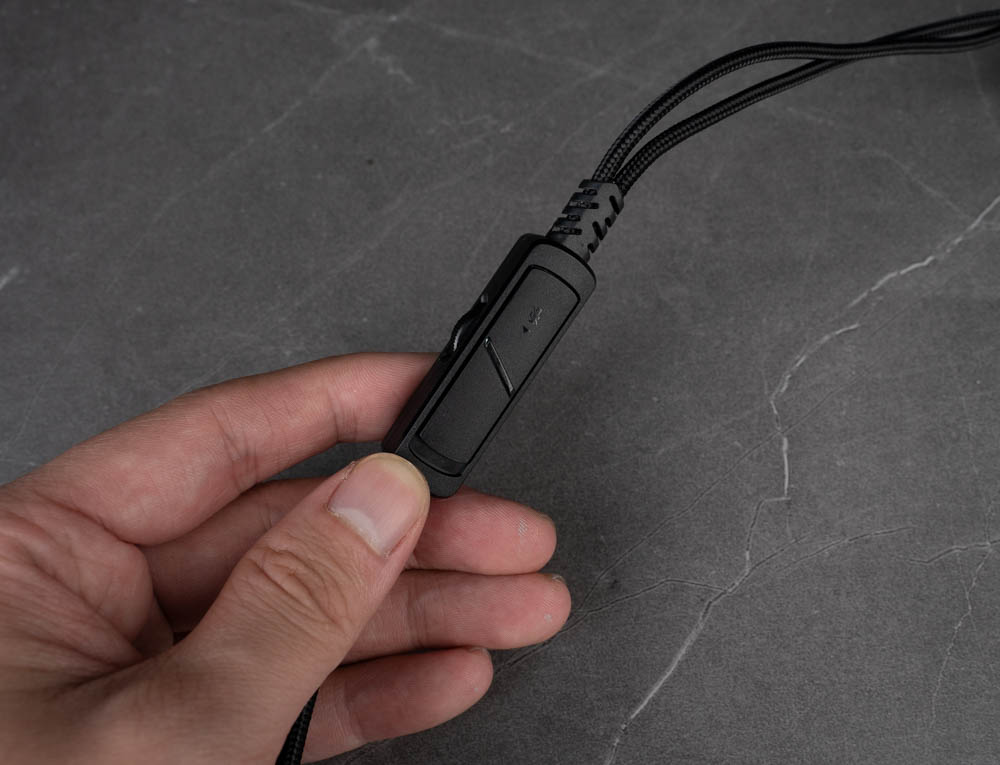 隨附的 3.5mm TRS 線材整合 MEMS 吊桿式麥克風,可透過 Type-C 轉接頭連接筆電或行動裝置使用。線控器支援麥克風靜音與音量調節,線材本體採用傘繩材質包覆,提升耐用度並減少纏繞與變形問題。