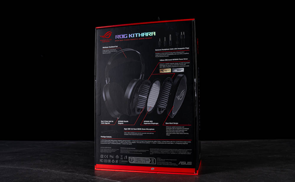 翻到包裝背面,可以看到 ROG 將 Kithara 的核心技術與結構設計清楚呈現。透過分解示意圖展示單體架構,並標示 100mm 平面振膜驅動單體、開放式設計與可替換插頭線材等重點規格,讓人一眼便能理解這款產品的技術定位與聲學取向。